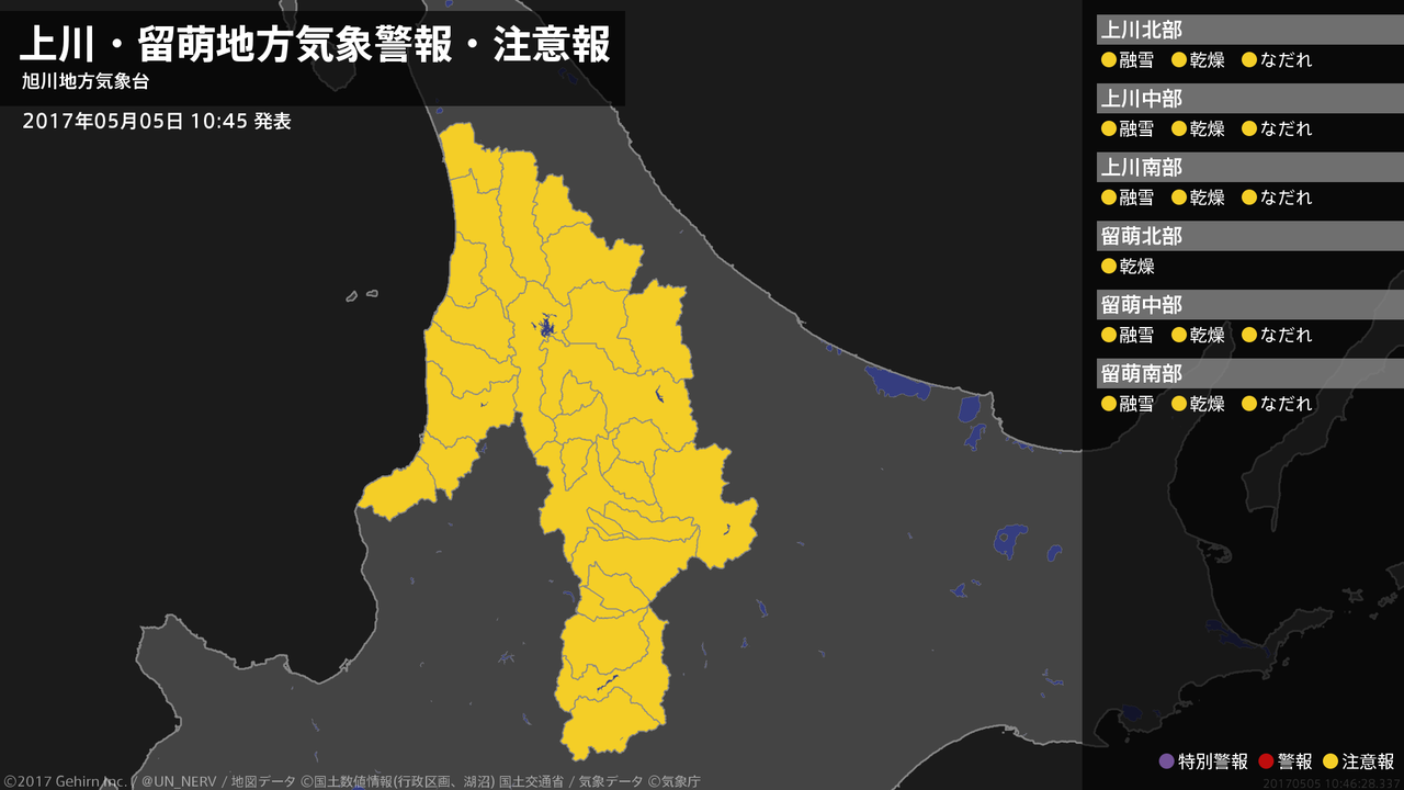 【上川・留萌地方 気象警報・注意報 2017年05月05日 10:46】上川、留萌地方では、融雪や空気の乾燥による火の取り扱い、なだれに注意してください。#気象警報注意報 #上川地方 #留萌地方