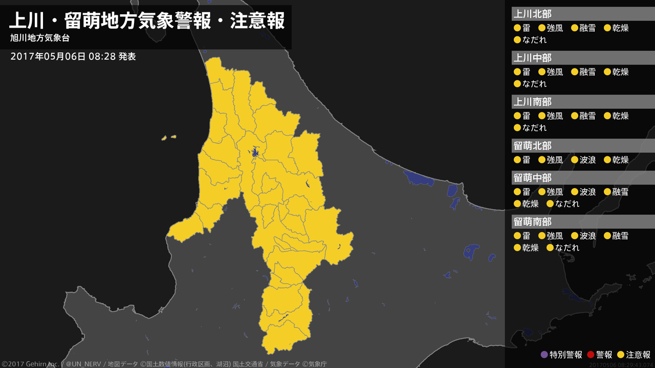 【上川・留萌地方 気象警報・注意報 2017年05月06日 08:29】上川、留萌地方では、強風や落雷、融雪、空気の乾燥による火の取り扱い、なだれに注意してください。留萌地方では、高波に注意してください。#気象警報注意報 #上川地方 #留萌地方
