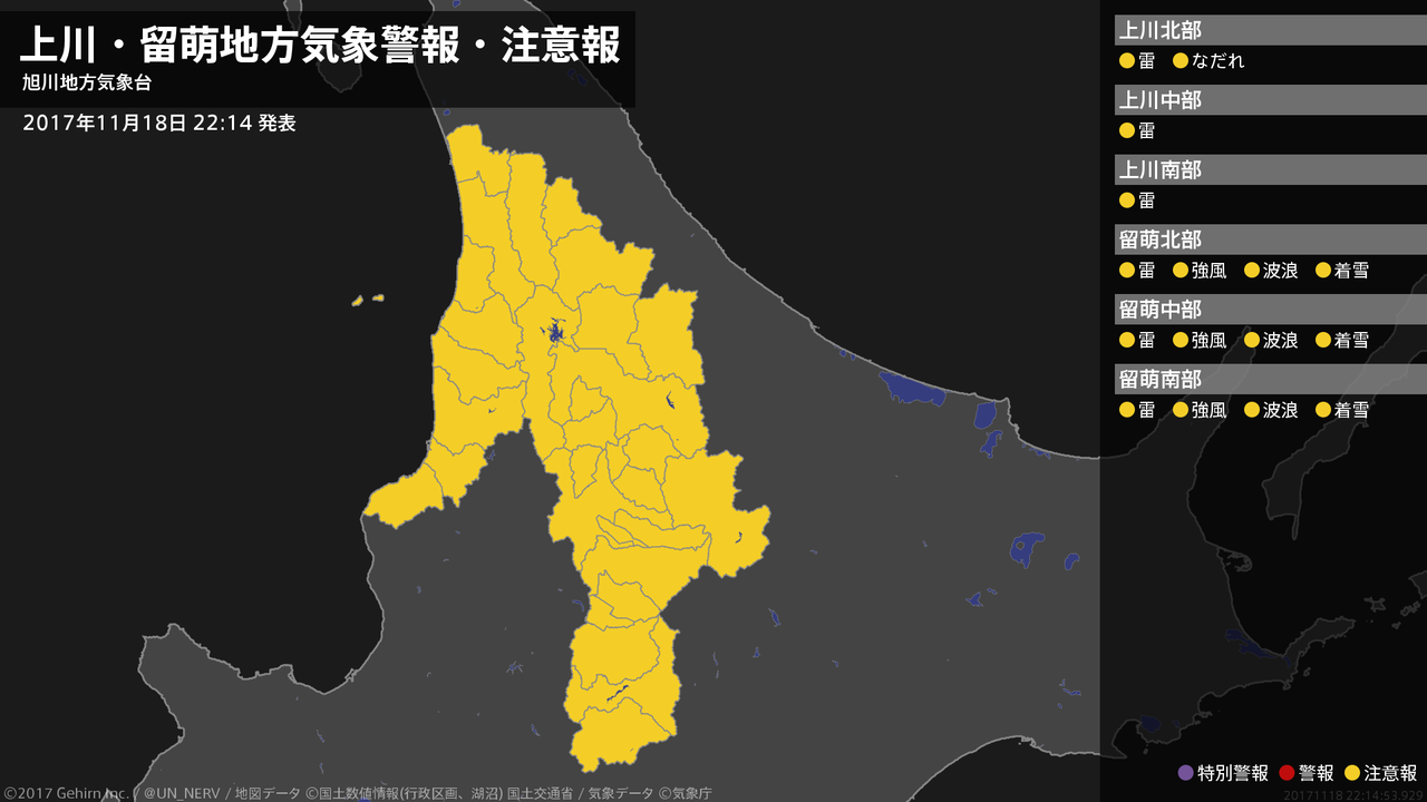 【上川・留萌地方 気象警報・注意報 2017年11月18日 22:14】留萌地方では、強風や高波、電線等への着雪に注意してください。上川、留萌地方では、落雷に注意してください。上川地方では、なだれに注意してください。#気象警報注意報 #上川地方 #留萌地方