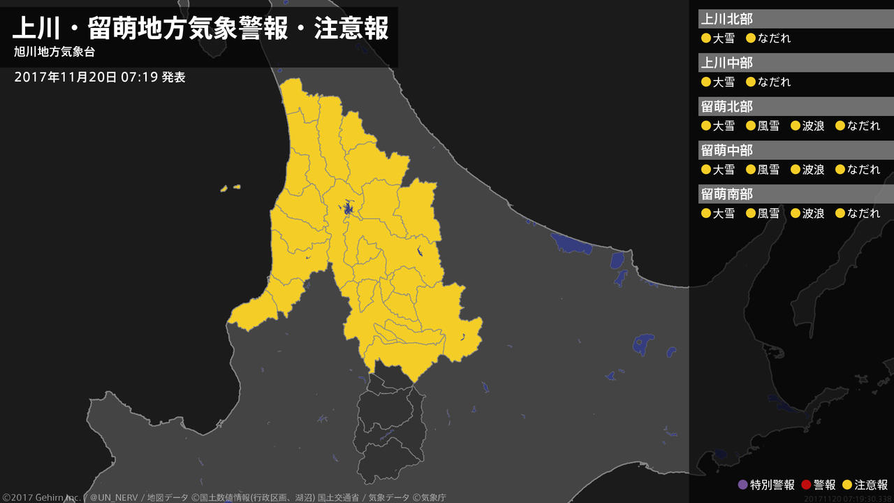 【上川・留萌地方 気象警報・注意報 2017年11月20日 04:43】留萌地方では、風雪や高波に注意してください。上川、留萌地方では、大雪やなだれに注意してください。#気象警報注意報 #上川地方 #留萌地方