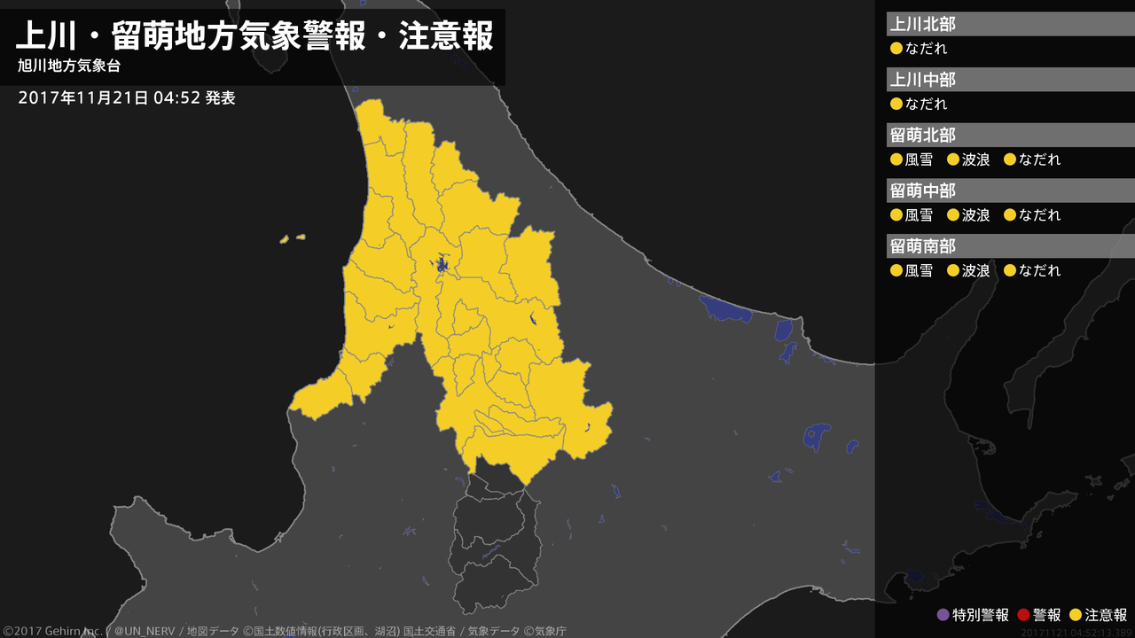 【上川・留萌地方 気象警報・注意報 2017年11月21日 04:52】留萌地方では、21日昼前まで風雪や高波に注意してください。上川、留萌地方では、22日までなだれに注意してください。#気象警報注意報 #上川地方 #留萌地方
