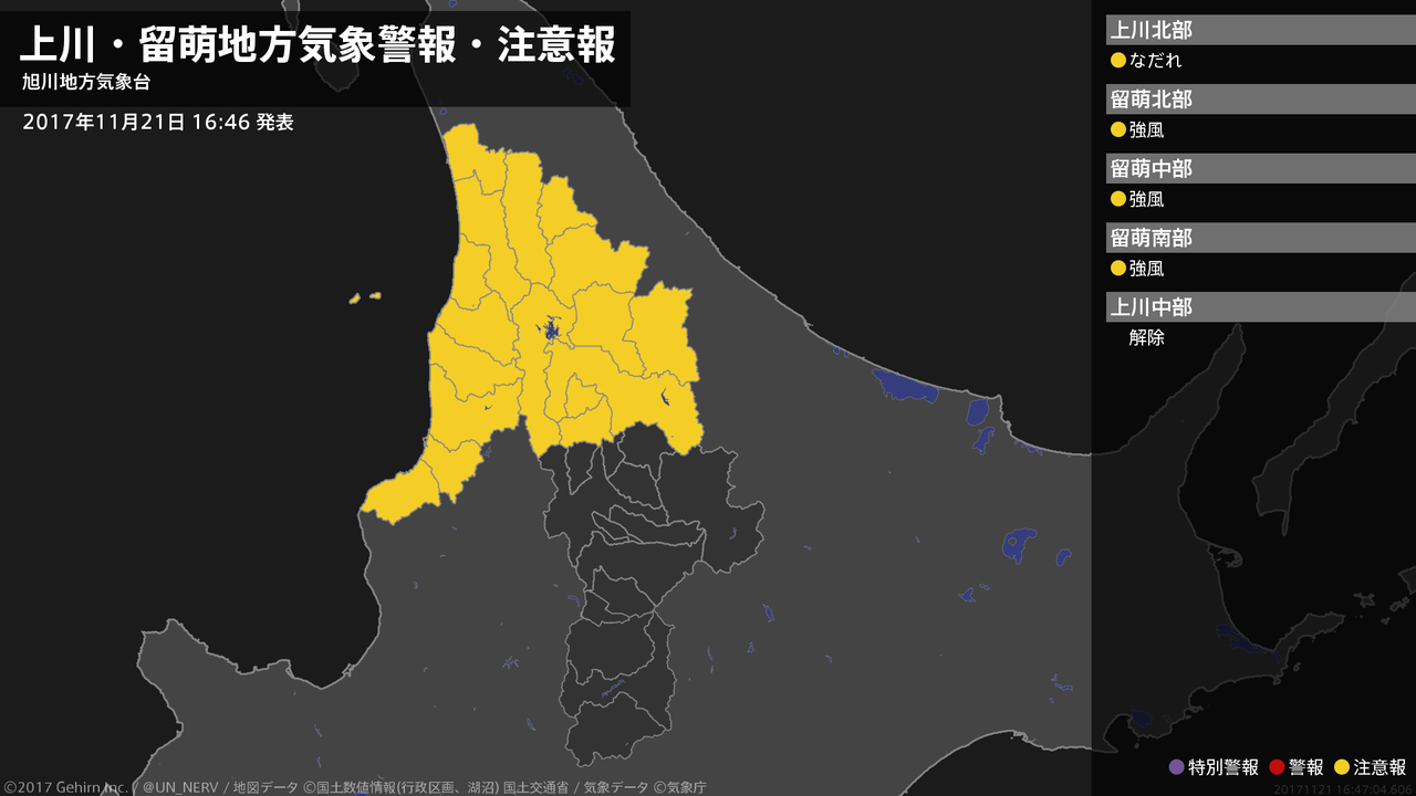 【上川・留萌地方 気象警報(解除) 2017年11月20日 19:11】上川・留萌地方に発表されていた気象警報はすべて解除されました。#気象警報 #上川地方 #留萌地方