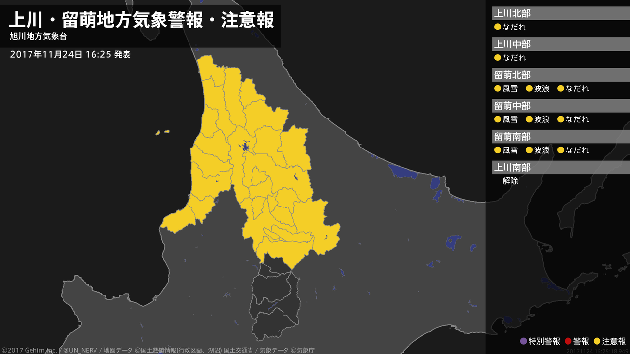 【上川・留萌地方 気象警報・注意報 2017年11月24日 16:25】