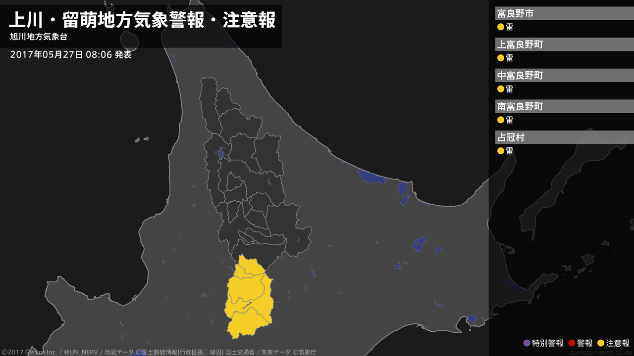 【上川・留萌地方 気象警報・注意報 2017年05月27日 08:08】上川地方では、27日昼過ぎから急な強い雨や落雷に注意してください。#気象警報注意報 #上川地方