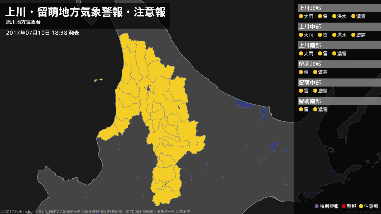 【上川・留萌地方 気象警報・注意報 2017年07月10日 18:40】上川地方では、土砂災害や低い土地の浸水、河川の増水に注意してください。上川、留萌地方では、竜巻などの激しい突風や落雷、濃霧による視程障害に注意してください。#気象警報注意報 #上川地方 #留萌地方