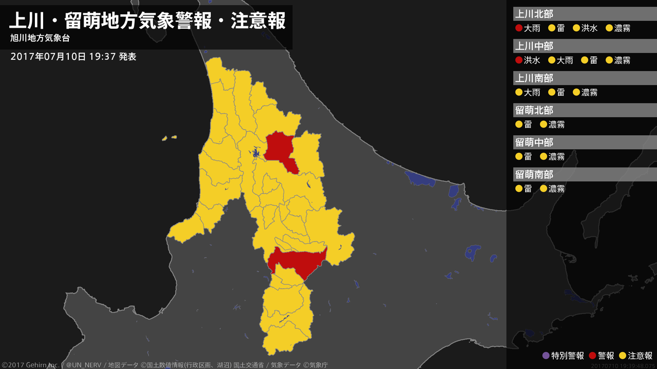 【上川・留萌地方 気象警報 2017年07月10日 19:39】上川地方では、10日夜遅くまで低い土地の浸水や河川の増水に警戒してください。#気象警報 #気象警報注意報 #上川地方 #留萌地方