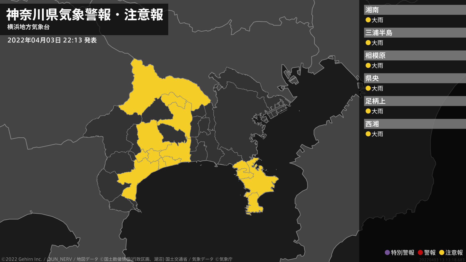 【神奈川県 気象警報・注意報 2022年04月03日 22:13】
