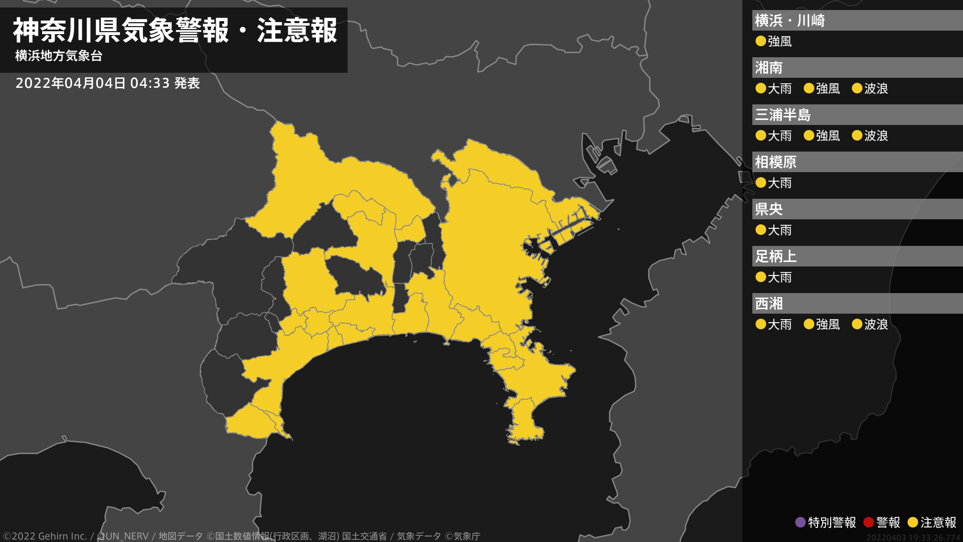 【神奈川県 気象警報・注意報 2022年04月04日 04:33】
