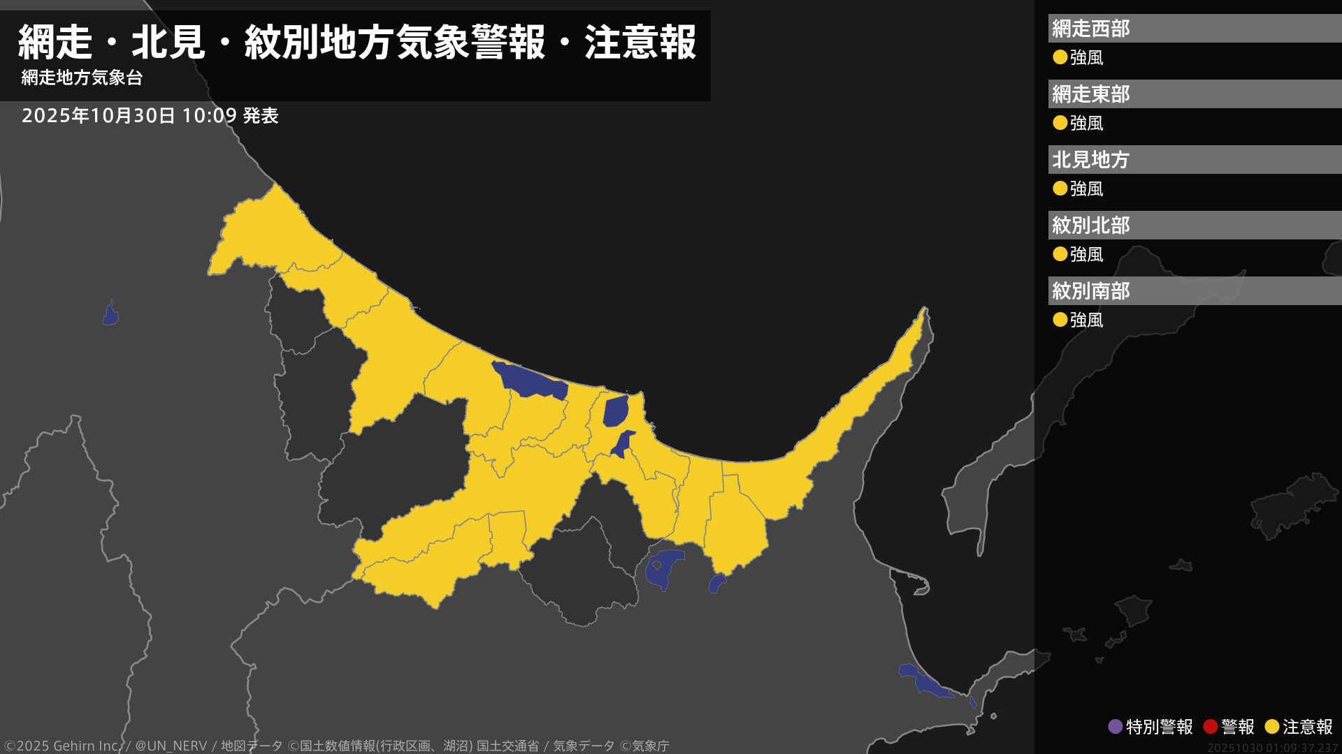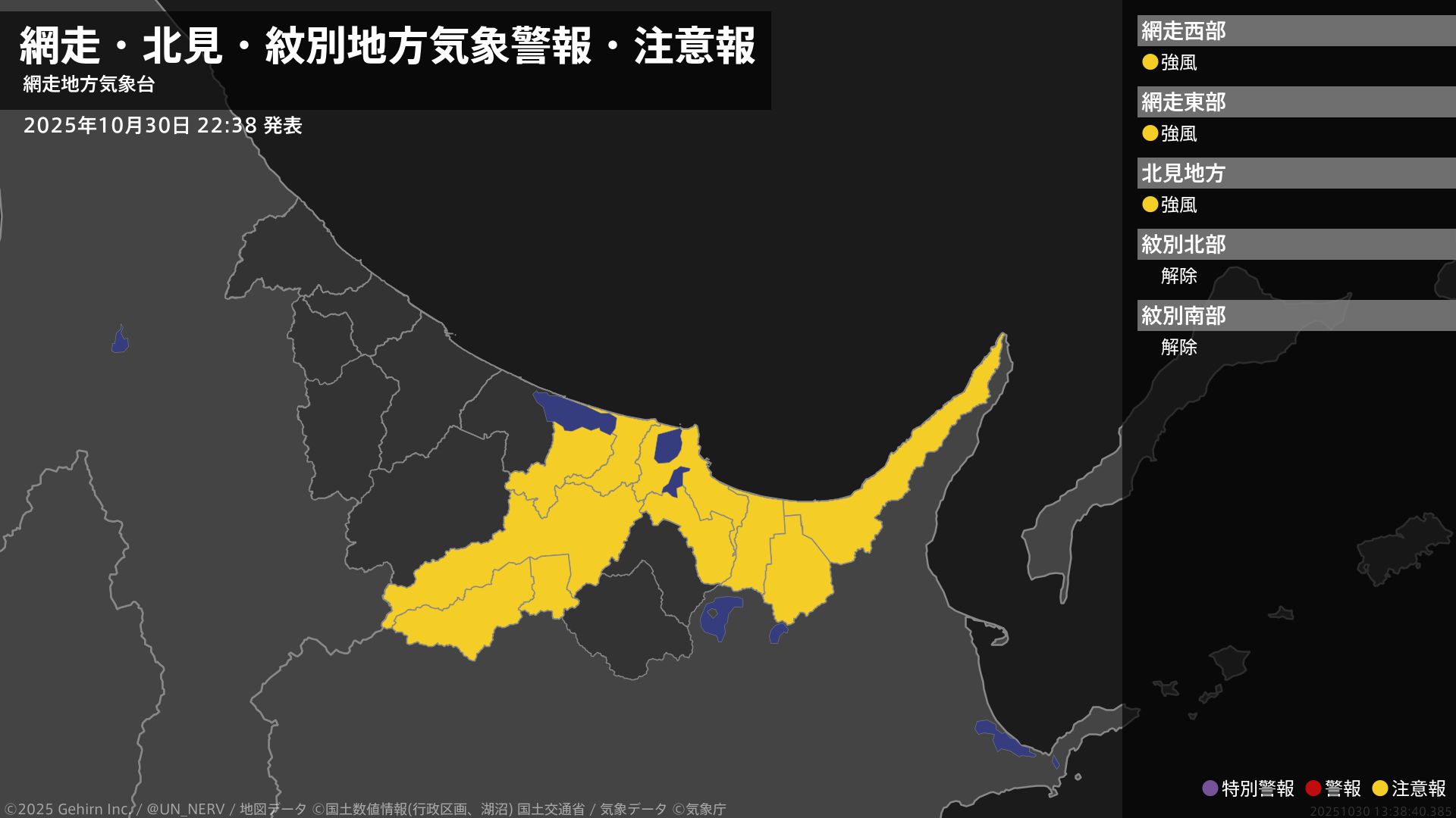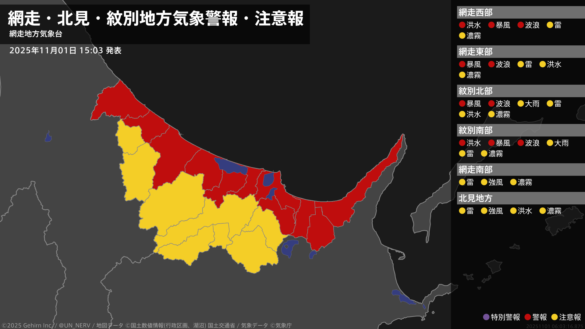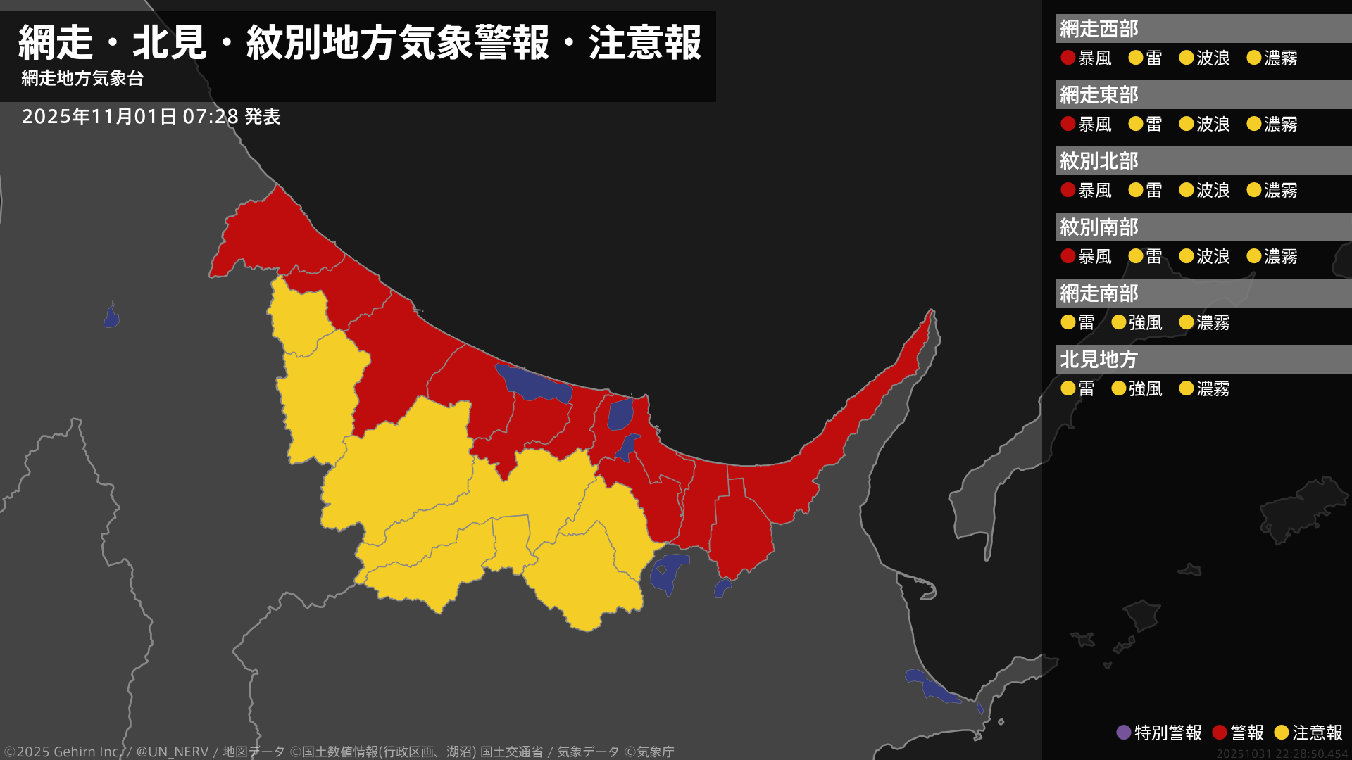 北日本では11月1日は暴風や高波に警戒し、北海道地方では高潮による低い土地の浸水に、東日本では高波に注意・警戒してください。また、東日本と北日本では1日にかけて、土砂災害、低い土地の浸水、河川の増水に注意・警戒し、全国的に落雷や竜巻などの激しい突風、降ひょうに注意してください。