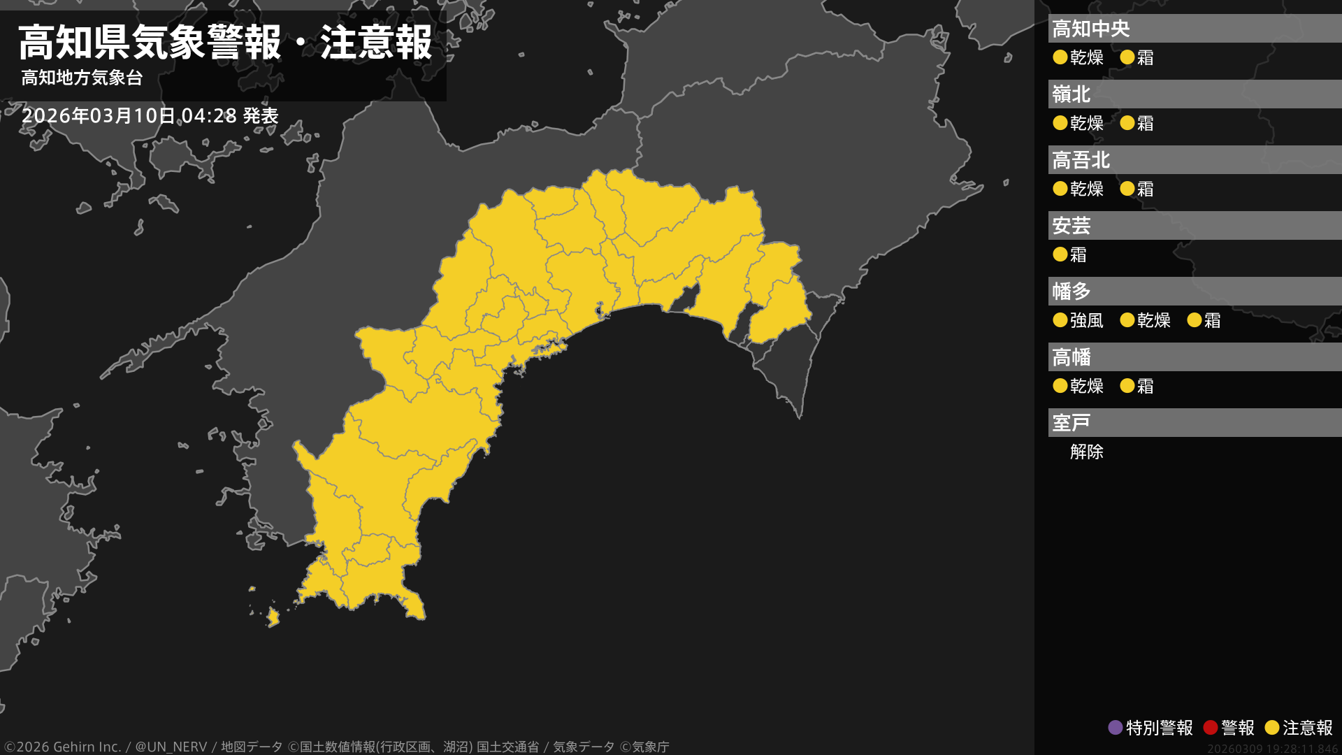 【高知県 気象警報・注意報 2026年03月10日 04:28】西部では、強風に注意してください。中部、西部では、空気の乾燥した状態が続くため、火の取り扱いに注意してください。高知県では、霜に対する農作物の管理に注意してください。#気象警報注意報 #高知県