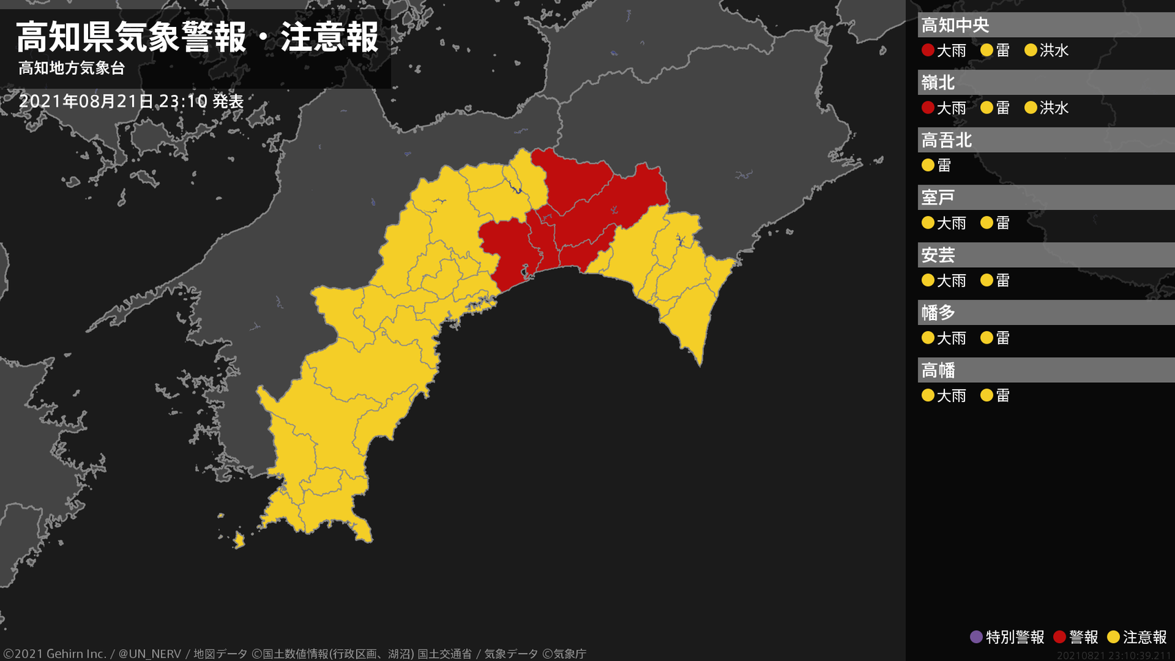 【高知県 気象警報・注意報 2021年08月21日 23:10】中部では、22日明け方まで土砂災害に警戒してください。#気象警報注意報 #高知県