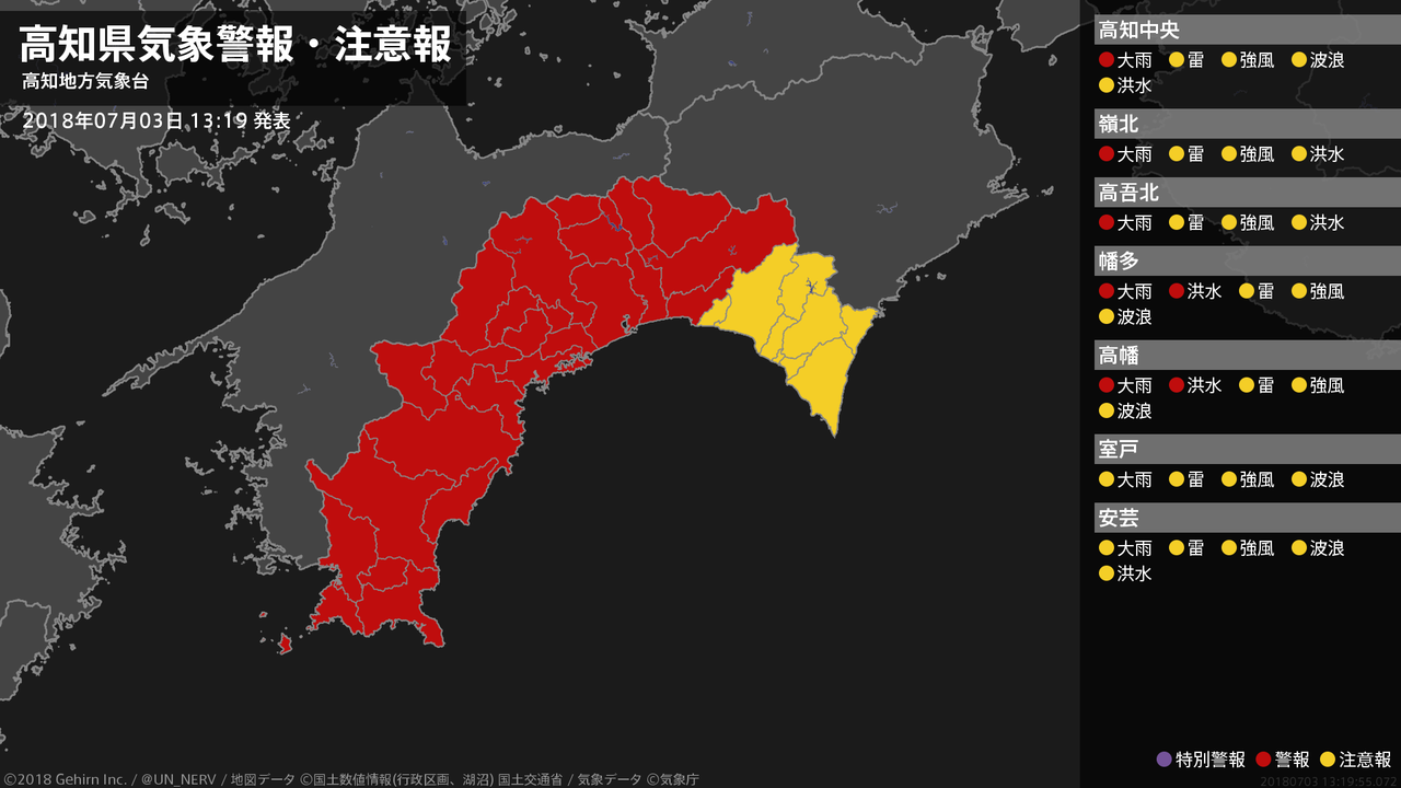 【高知県 気象警報 2018年07月03日 13:20】中部、西部では、土砂災害や低い土地の浸水に警戒してください。西部では、河川の増水に警戒してください。#気象警報 #気象警報注意報 #高知県