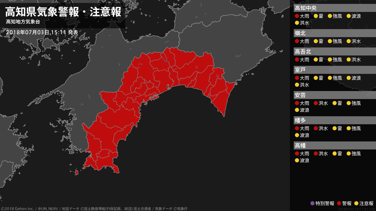 【高知県 気象警報 2018年07月03日 15:11】高知県では、土砂災害や低い土地の浸水に警戒してください。東部、西部では、河川の増水に警戒してください。#気象警報 #気象警報注意報 #高知県