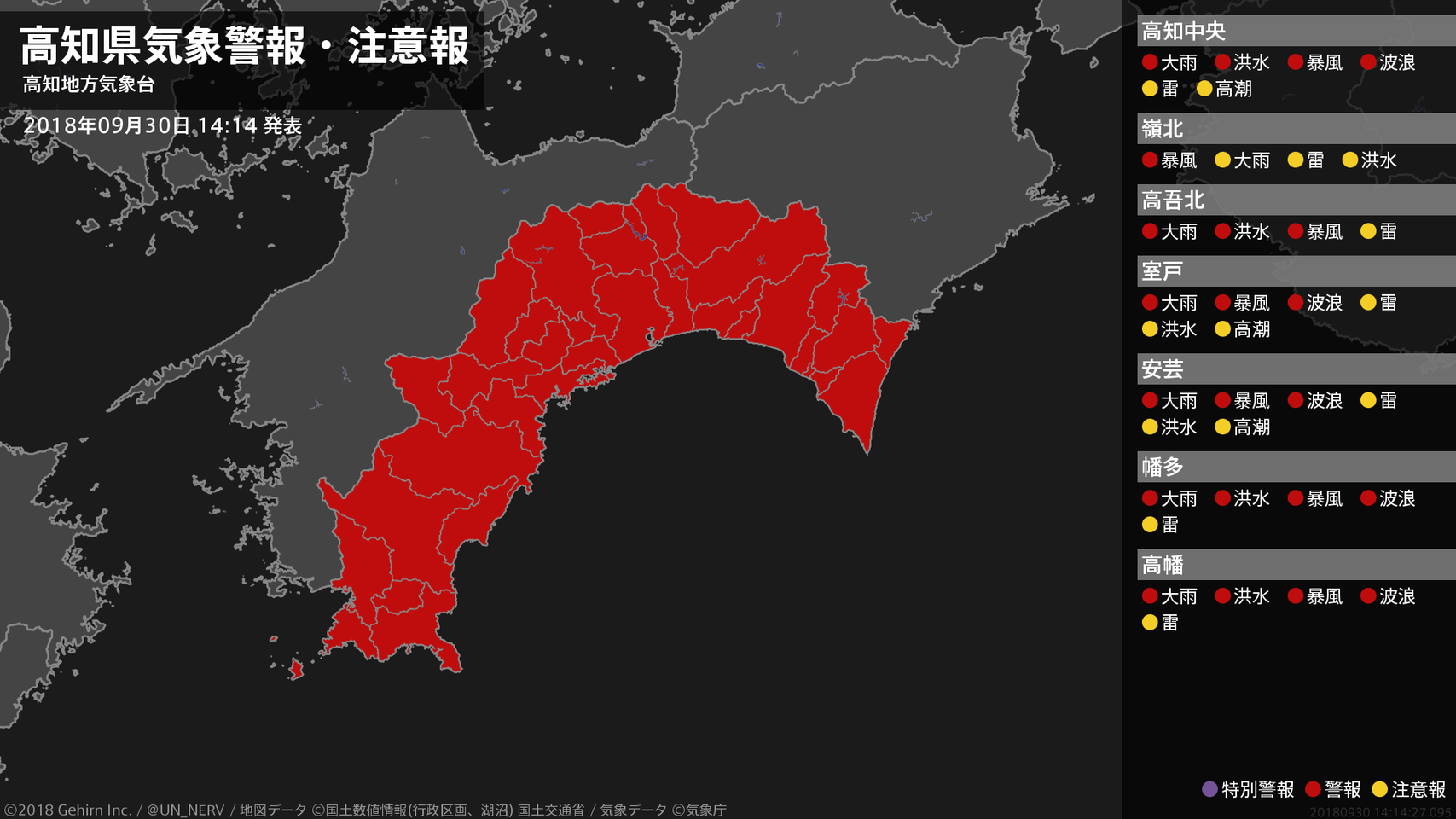 【高知県 気象警報・注意報 2018年09月30日 14:14】西部では、土砂災害に警戒してください。高知県では、低い土地の浸水や暴風、高波に警戒してください。中部、西部では、河川の増水に警戒してください。#気象警報注意報 #高知県