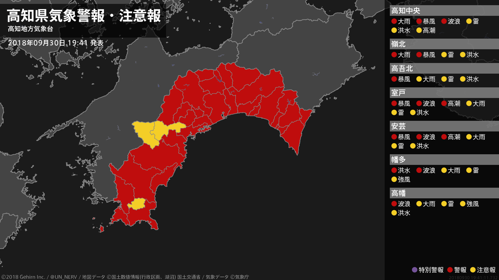 【高知県 気象警報・注意報 2018年09月30日 19:41】