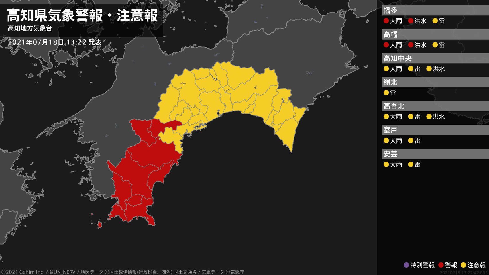【高知県 気象警報・注意報 2021年07月18日 13:22】
