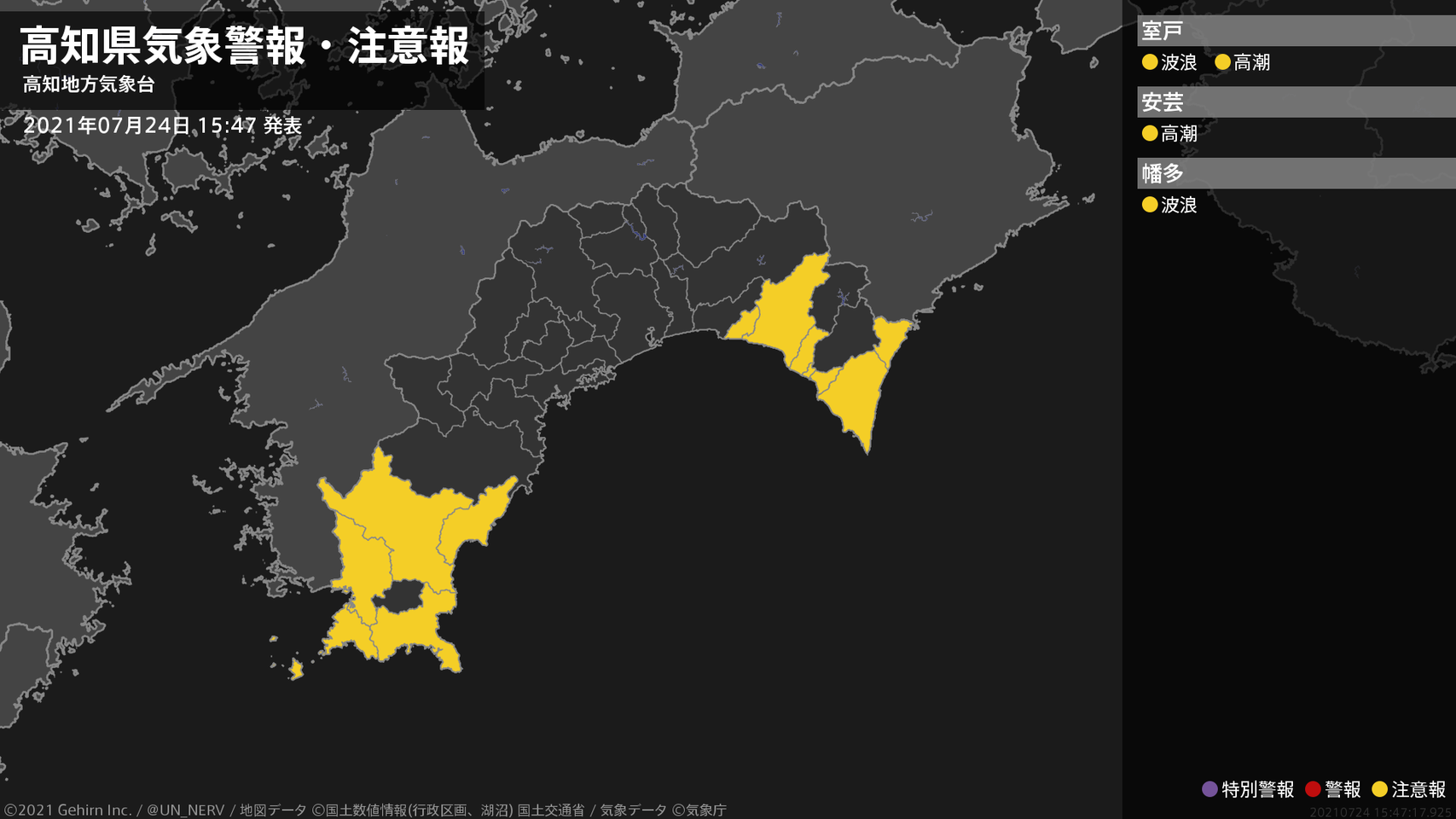 【高知県 気象警報・注意報 2021年07月23日 19:43】高知県では、高波に注意してください。#気象警報注意報 #高知県
