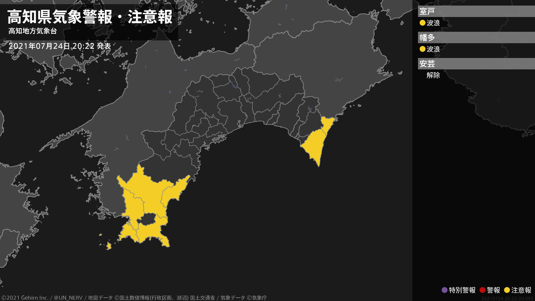 【高知県 気象警報・注意報 2021年07月24日 20:22】東部、西部では、25日昼前まで高波に注意してください。#気象警報注意報 #高知県