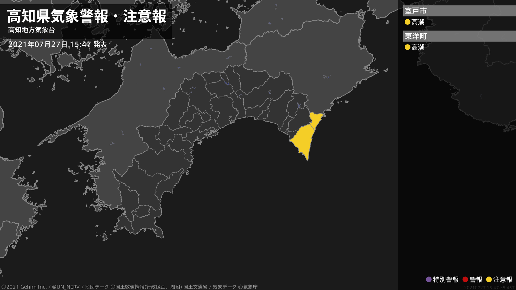 【高知県 気象警報・注意報 2021年07月27日 15:47】東部では、27日夜のはじめ頃から27日夜遅くまで高潮に注意してください。#気象警報注意報 #高知県
