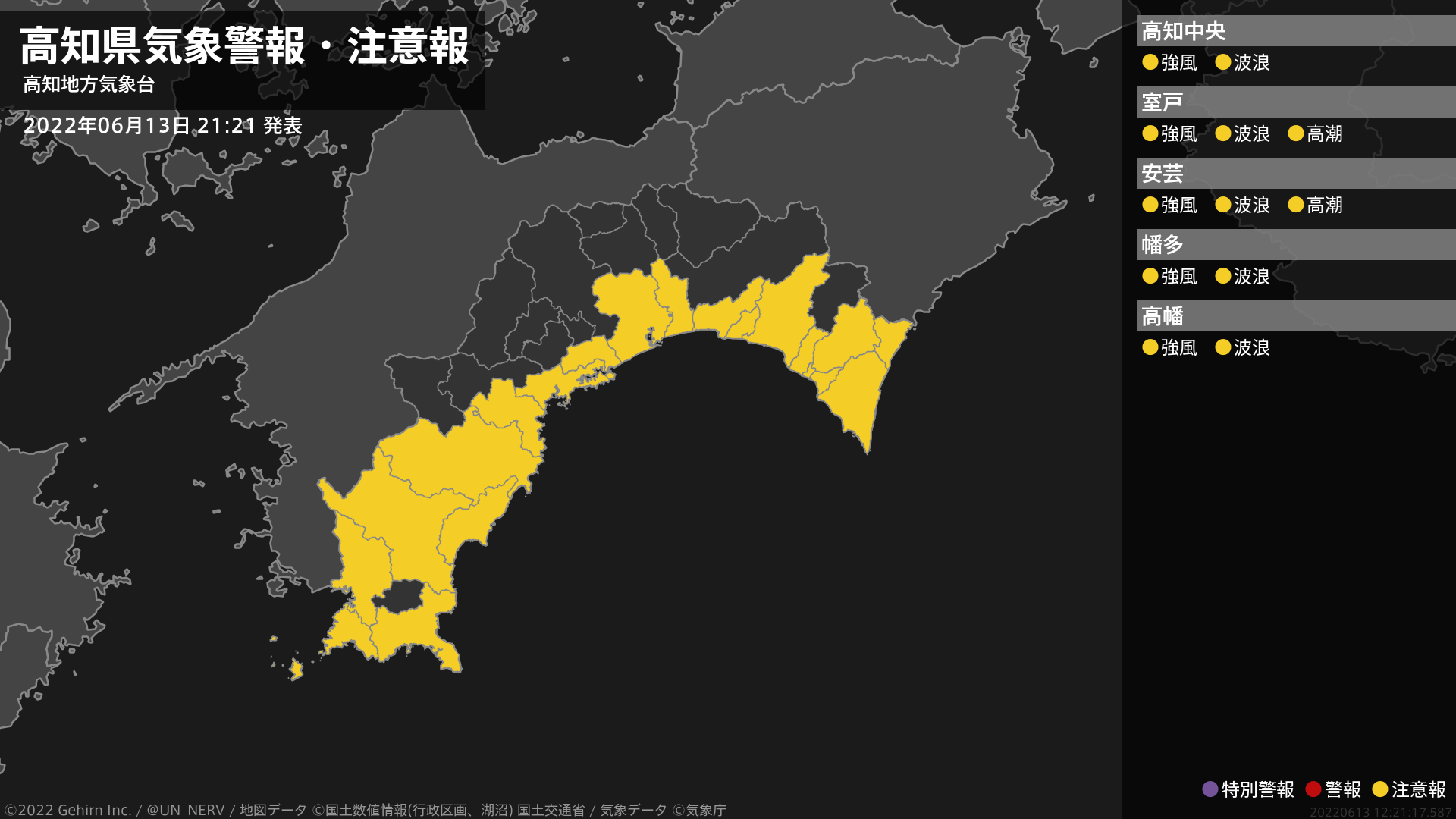 【高知県 気象警報・注意報 2022年06月13日 21:21】高知県では、強風や高波に注意してください。東部では、高潮に注意してください。#気象警報注意報 #高知県