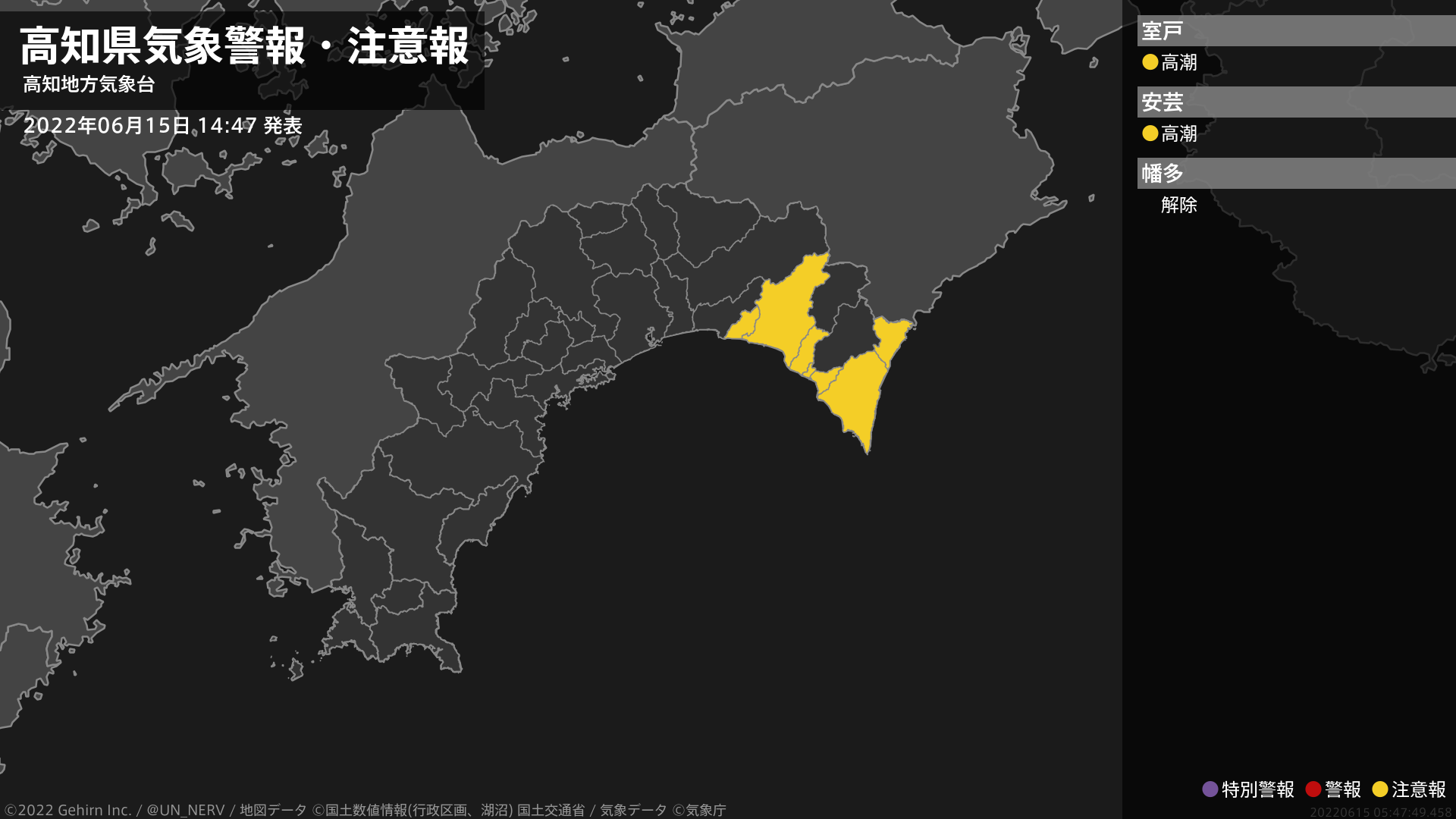 【高知県 気象警報・注意報 2022年06月15日 14:47】東部では、15日夜のはじめ頃は高潮に注意してください。#気象警報注意報 #高知県