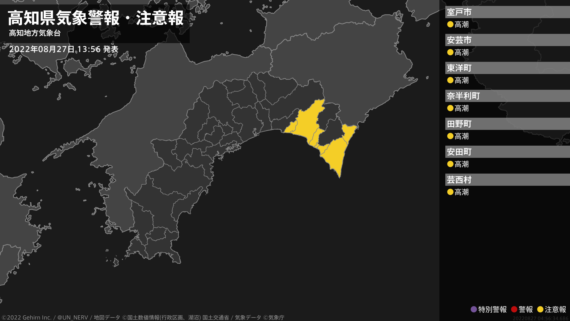 【高知県 気象警報・注意報 2022年08月27日 13:56】東部では、27日夕方から27日夜のはじめ頃まで高潮に注意してください。#気象警報注意報 #高知県