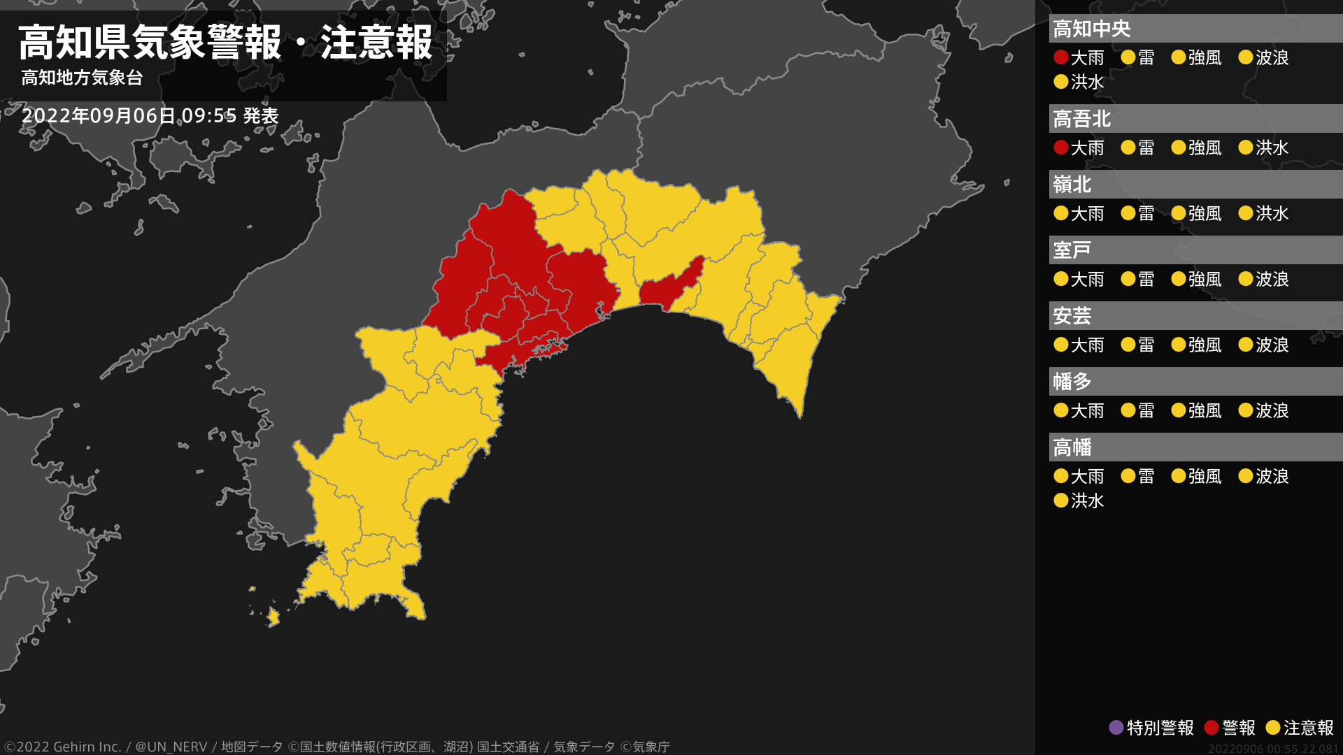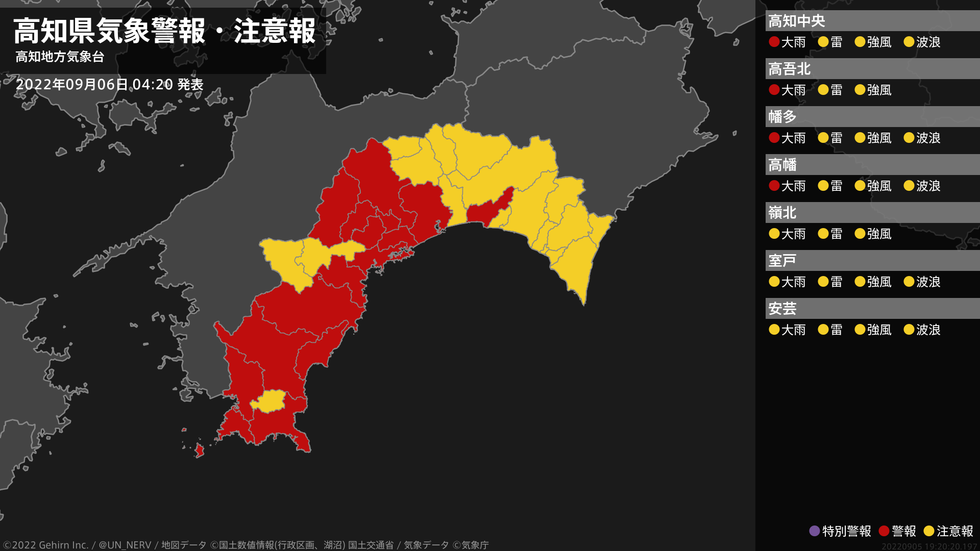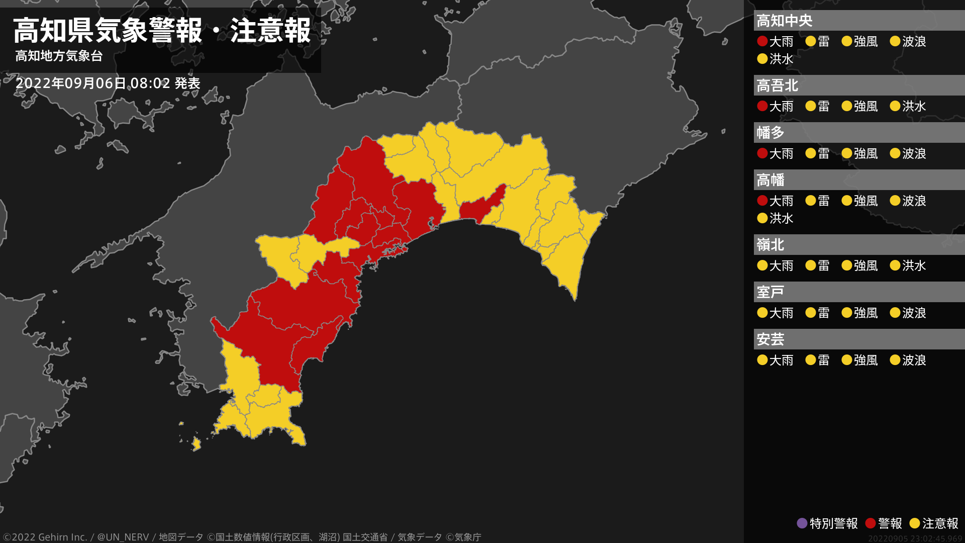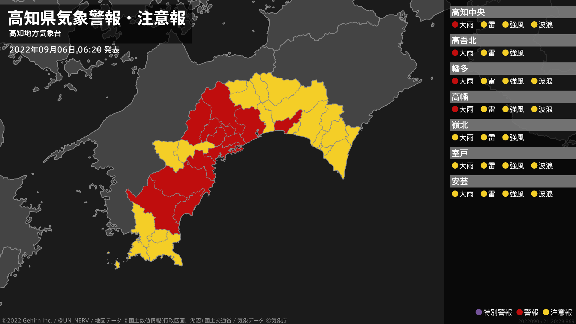 【高知県 気象警報 2022年09月05日 20:05】高知県に気象警報が発表されています。#気象警報 #気象警報注意報 #高知県