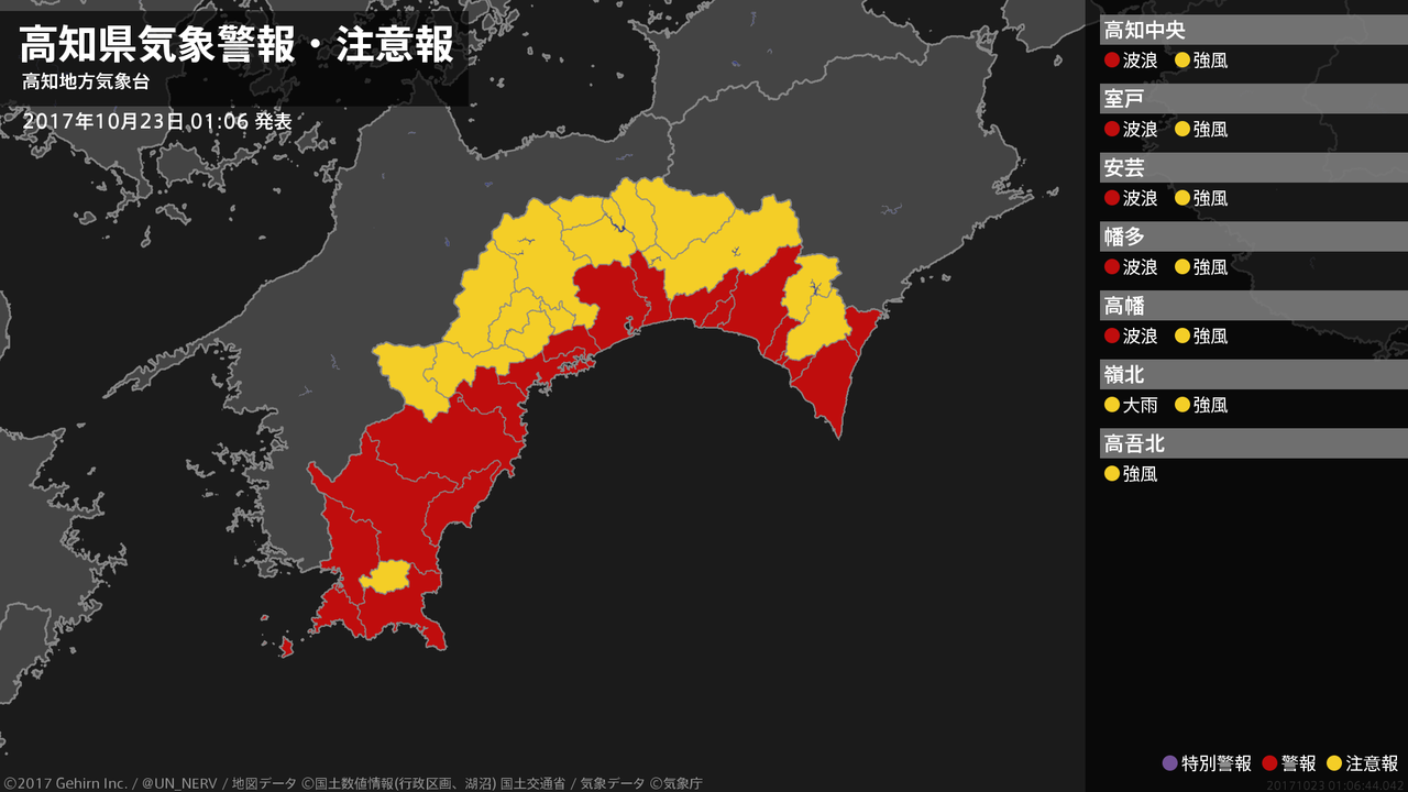 【高知県 気象警報 2017年10月23日 01:06】高知県では、23日明け方まで高波に警戒してください。#気象警報 #気象警報注意報 #高知県