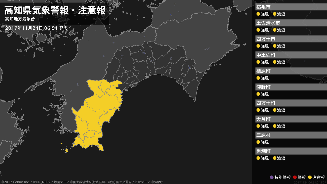 【高知県 気象警報・注意報 2017年11月24日 06:51】西部では、24日昼前まで強風や高波に注意してください。#気象警報注意報 #高知県