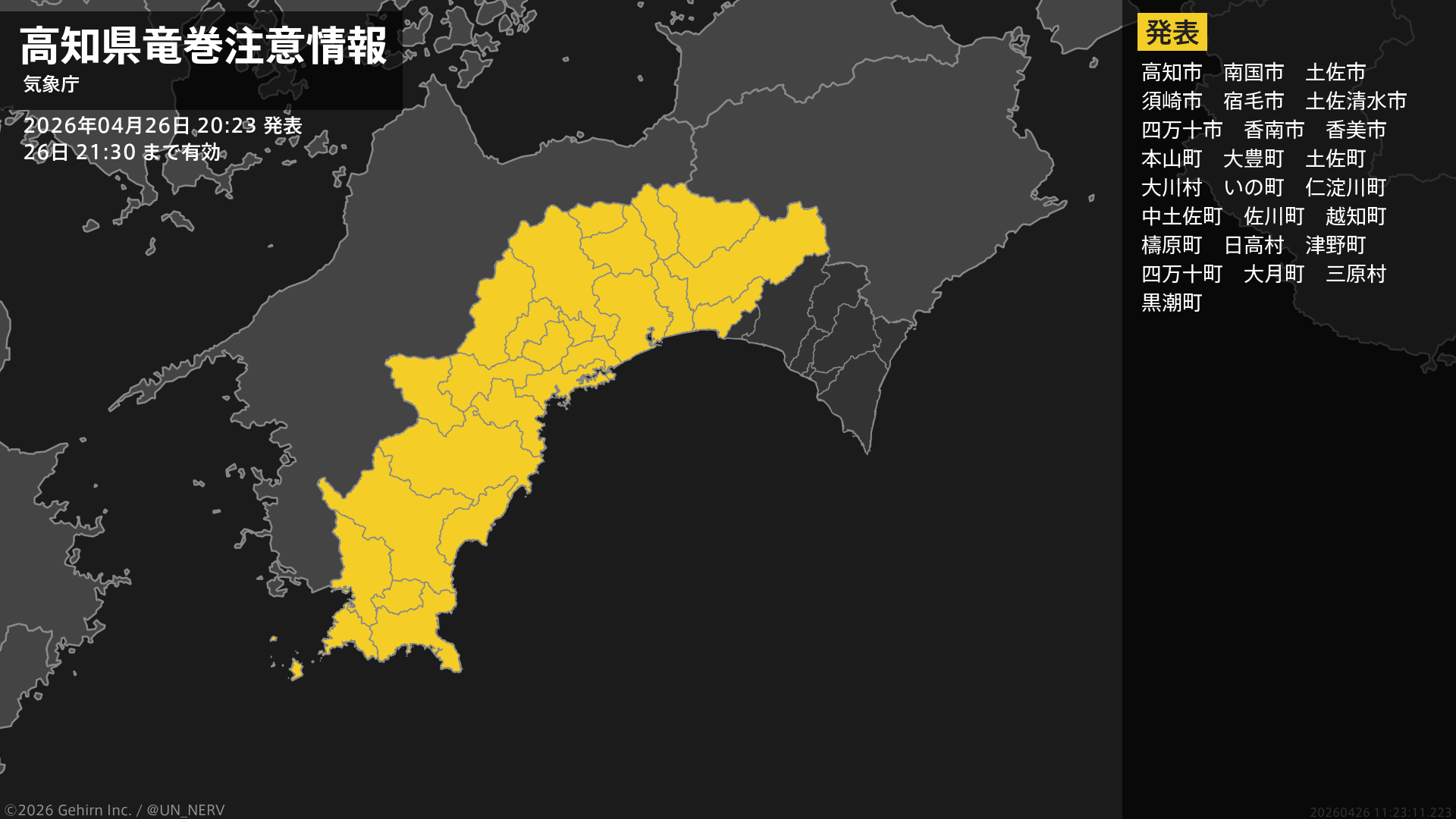 【高知県 竜巻注意情報】高知県は、竜巻などの激しい突風が発生しやすい気象状況になっています。頑丈な建物内に移動するなど安全確保に努めてください。この情報は26日21:30まで有効です。#竜巻注意情報 #高知県