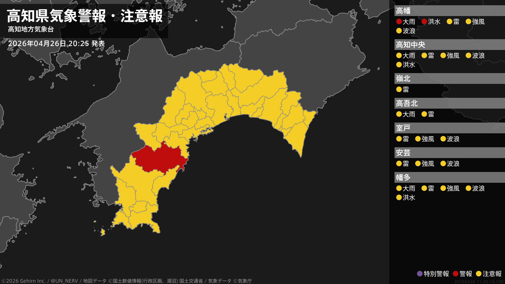 【高知県 気象警報・注意報 2026年04月26日 20:25】西部では、26日夜のはじめ頃まで低い土地の浸水や河川の増水に警戒してください。#気象警報注意報 #高知県