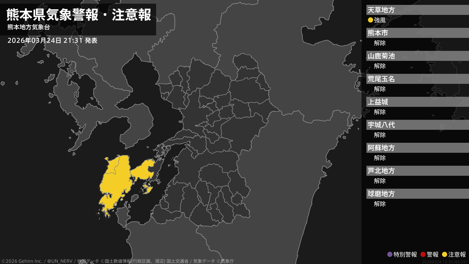 【熊本県 気象警報・注意報 2026年03月24日 21:31】天草・芦北地方では、25日明け方から強風に注意してください。#気象警報注意報 #熊本県