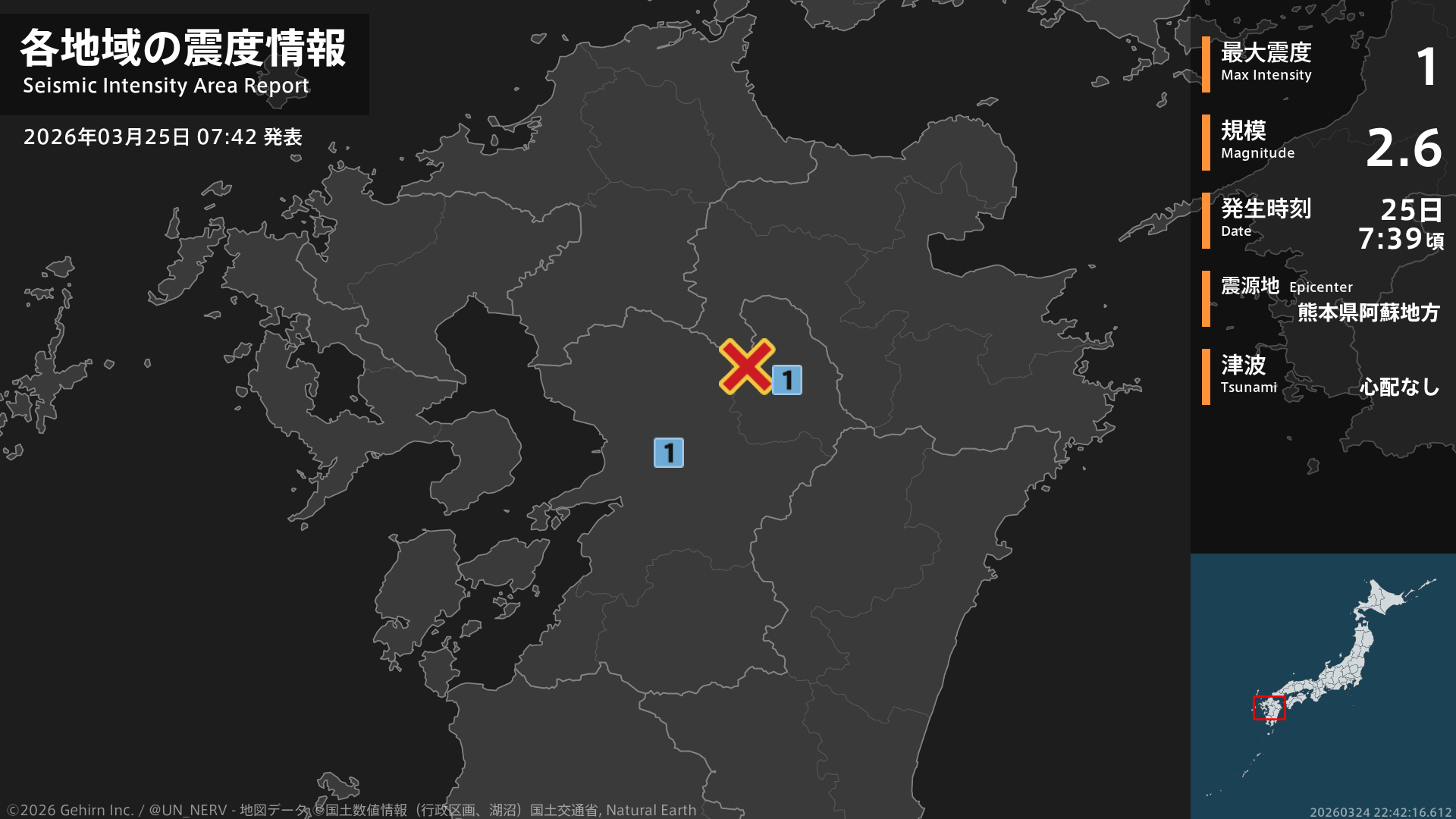 【地震情報 2026年3月25日】7時39分頃、熊本県阿蘇地方を震源とする地震がありました。震源の深さは約10km、地震の規模はM2.6、最大震度1を熊本県で観測しています。この地震による津波の心配はありません。#地震 #熊本県