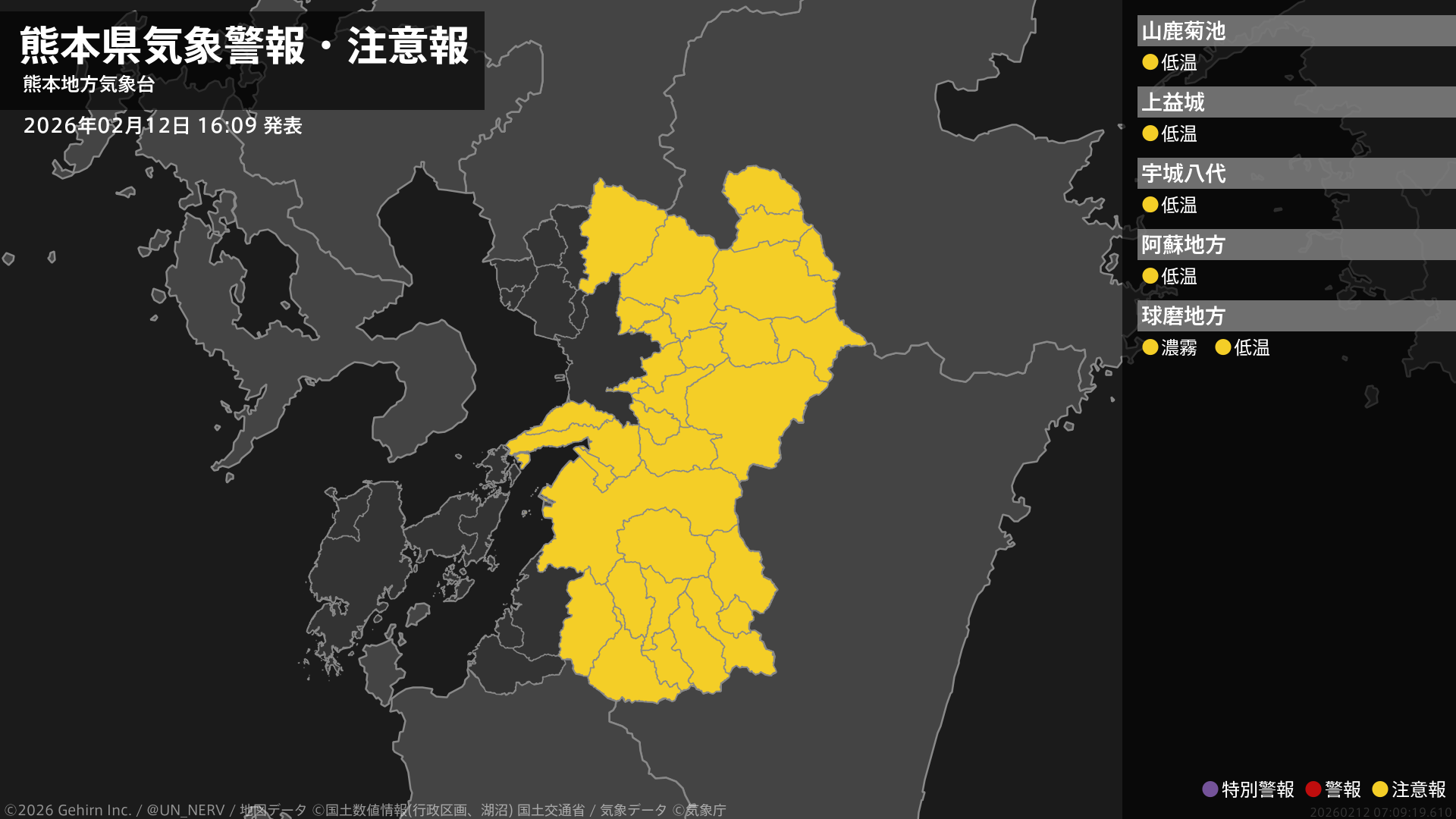 【熊本県 気象警報・注意報 2026年02月12日 16:09】球磨地方では、13日明け方から13日昼前まで濃霧による視程障害に注意してください。熊本、阿蘇、球磨地方では、13日まで低温に注意してください。#気象警報注意報 #熊本県