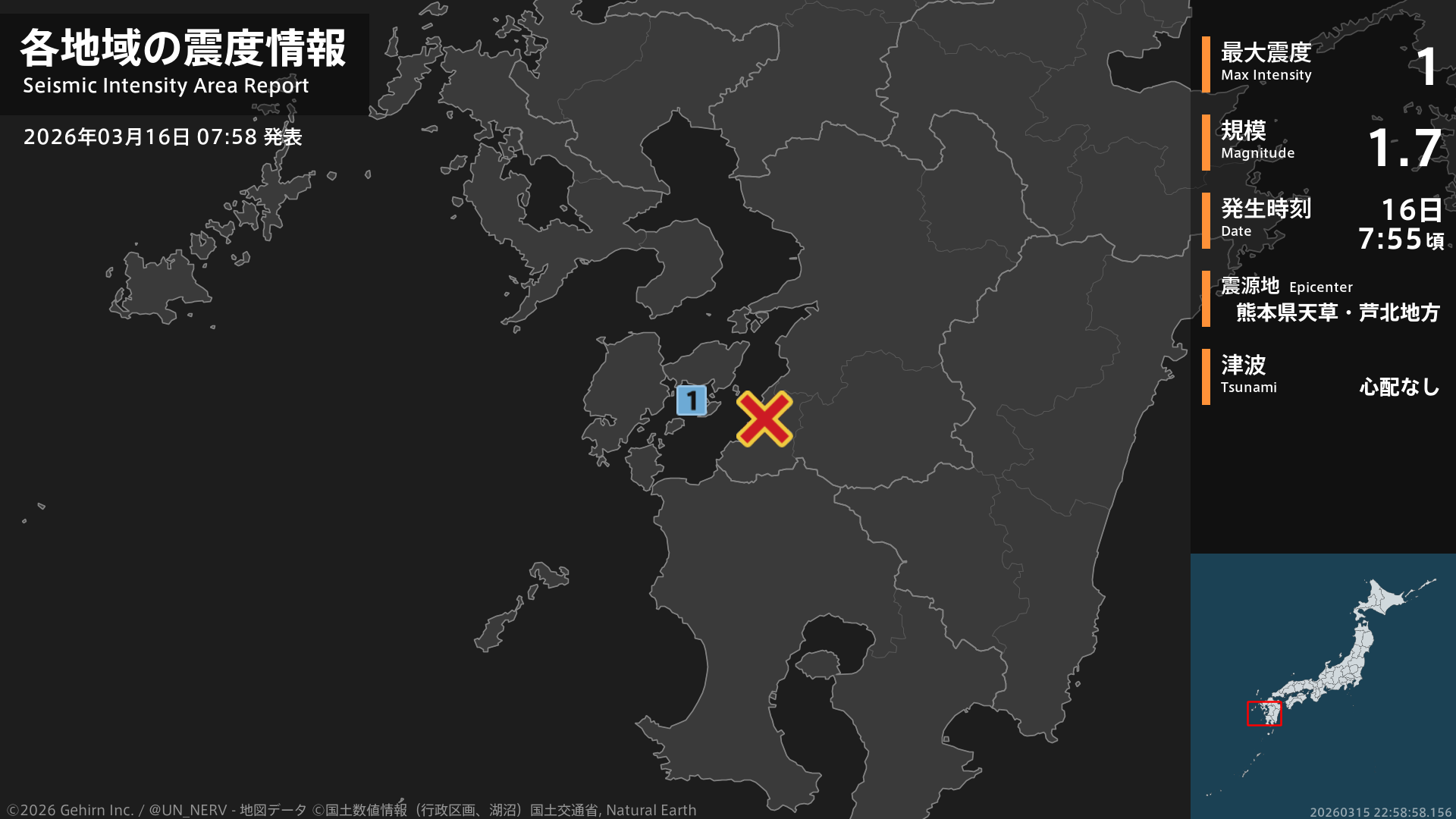 【地震情報 2026年3月16日】1時59分頃、熊本県天草・芦北地方を震源とする地震がありました。震源の深さはごく浅い、地震の規模はM1.9、最大震度1を熊本県で観測しています。この地震による津波の心配はありません。#地震 #熊本県