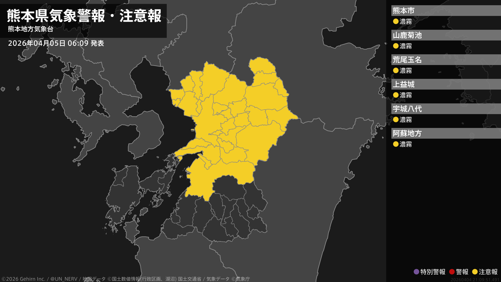 【熊本県 気象警報・注意報 2026年04月05日 06:09】熊本、阿蘇地方では、5日昼前まで濃霧による視程障害に注意してください。#気象警報注意報 #熊本県