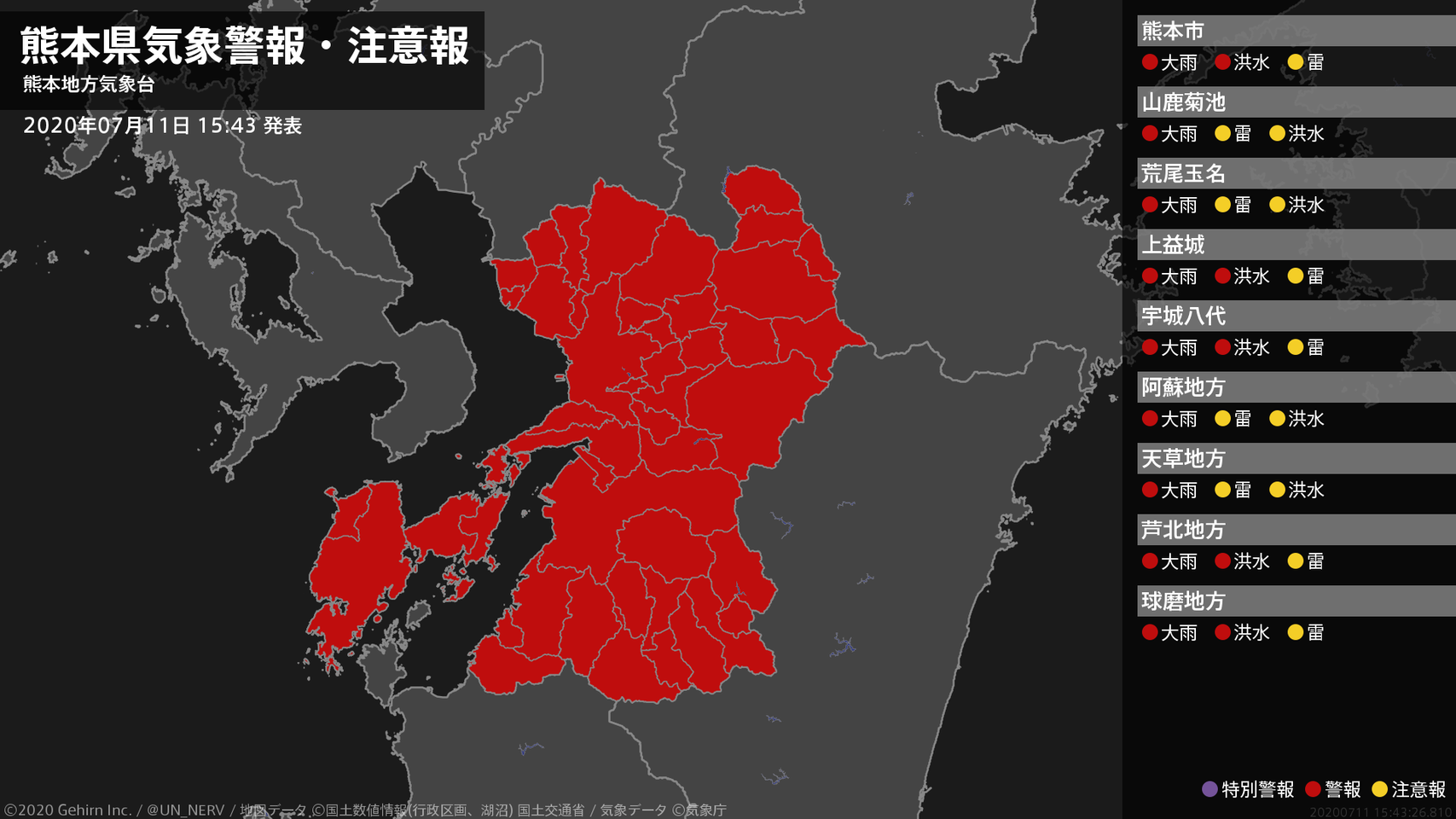 【熊本県 気象警報・注意報 2020年07月11日 16:19】