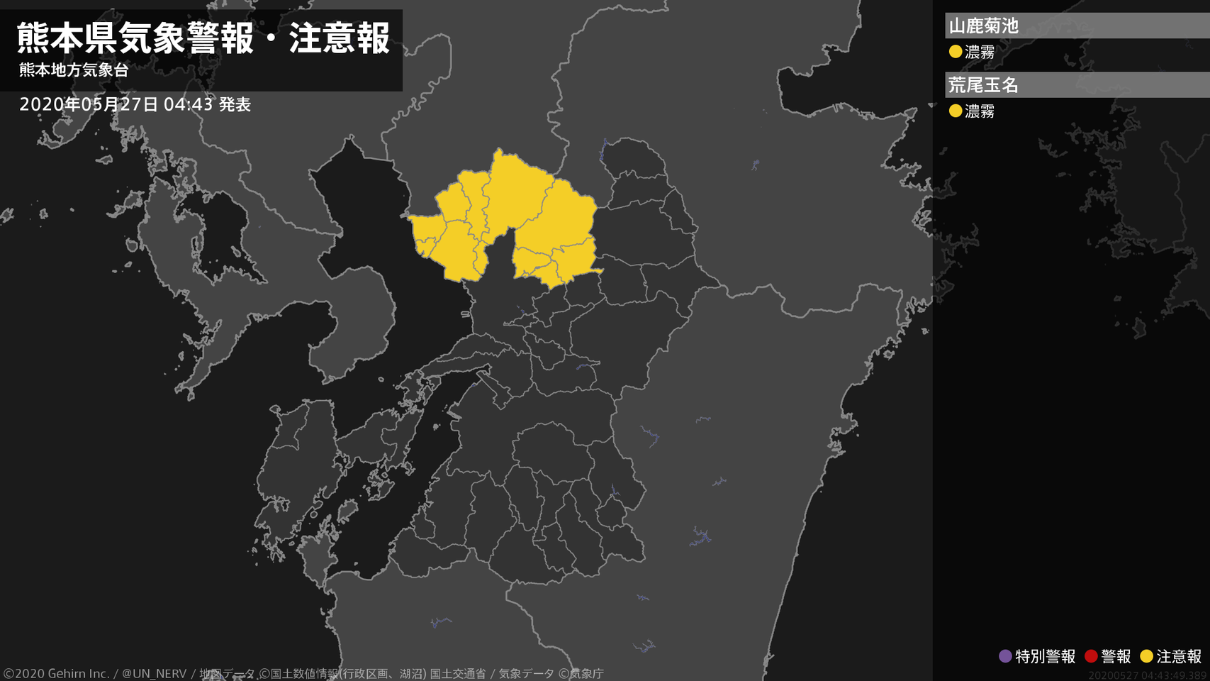【熊本県 気象警報・注意報 2020年05月27日 04:43】熊本地方では、27日昼前まで濃霧による視程障害に注意してください。#気象警報注意報 #熊本県