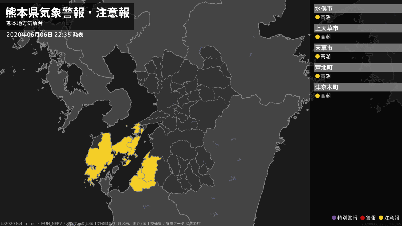 【熊本県 気象警報・注意報 2020年06月06日 22:35】天草・芦北地方では、7日まで高潮に注意してください。#気象警報注意報 #熊本県
