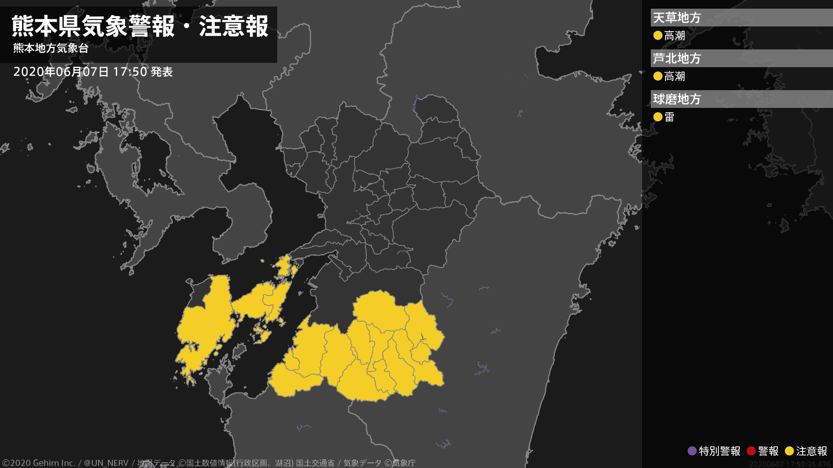 【熊本県 気象警報・注意報 2020年06月07日 17:50】天草・芦北地方では、7日まで高潮に注意してください。球磨地方では、7日夜のはじめ頃まで急な強い雨や落雷に注意してください。#気象警報注意報 #熊本県