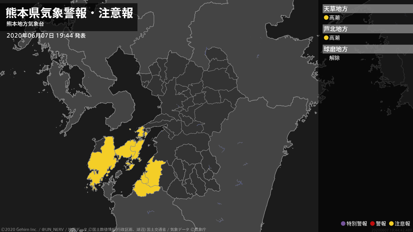 【熊本県 気象警報・注意報 2020年06月07日 19:44】天草・芦北地方では、7日まで高潮に注意してください。#気象警報注意報 #熊本県