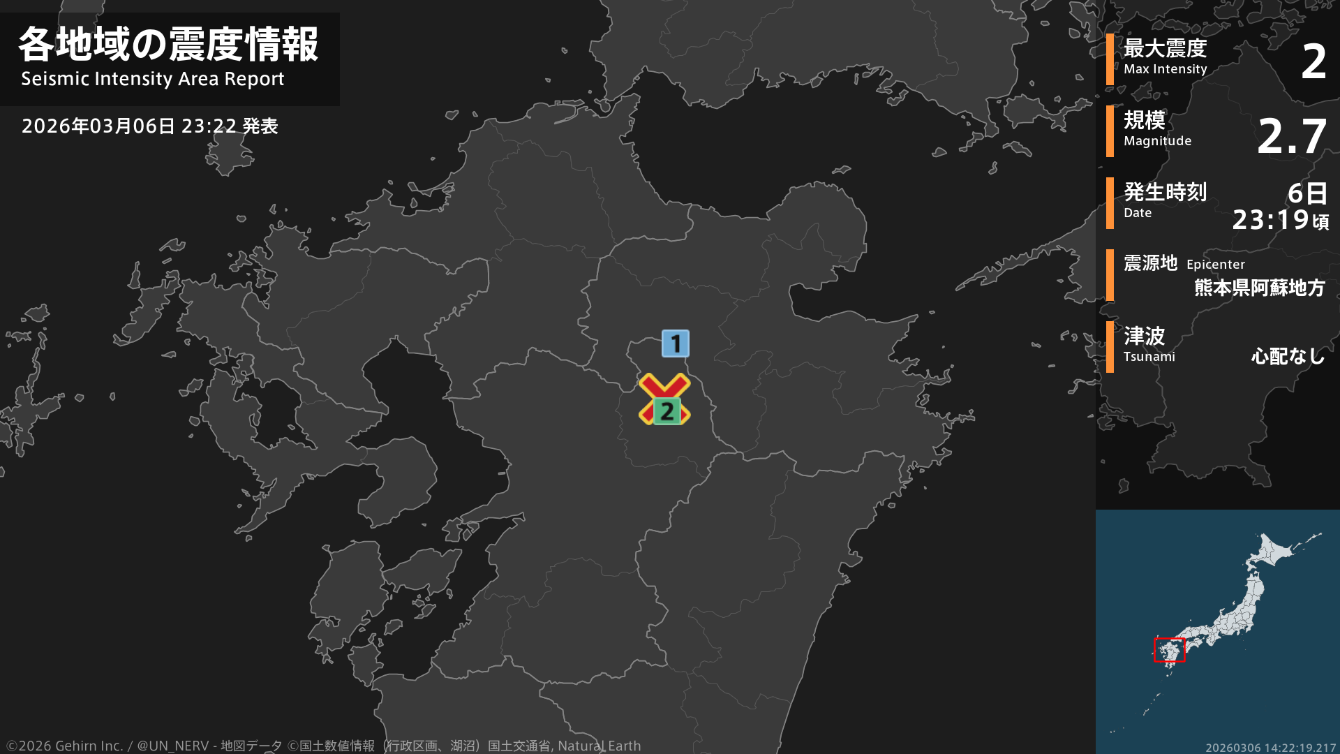 【地震情報 2026年3月6日】23時19分頃、熊本県阿蘇地方を震源とする地震がありました。震源の深さは約10km、地震の規模はM2.7、最大震度2を熊本県で観測しています。この地震による津波の心配はありません。#地震 #熊本県 #大分県