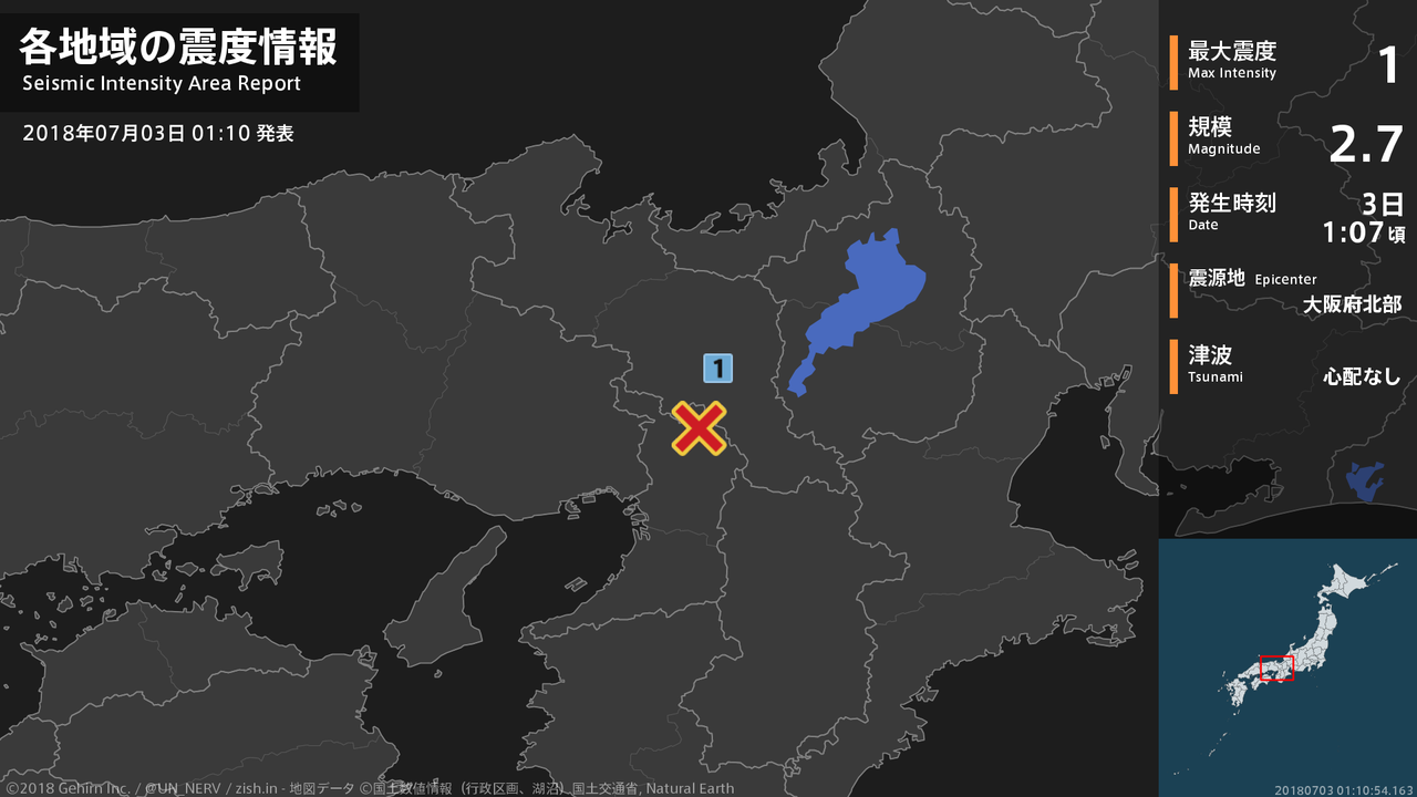 【地震情報 2018年7月3日】1時7分頃、大阪府北部を震源とする地震がありました。震源の深さは約10km、地震の規模はM2.7、最大震度1を京都府で観測しています。この地震による津波の心配はありません。#地震 #京都府