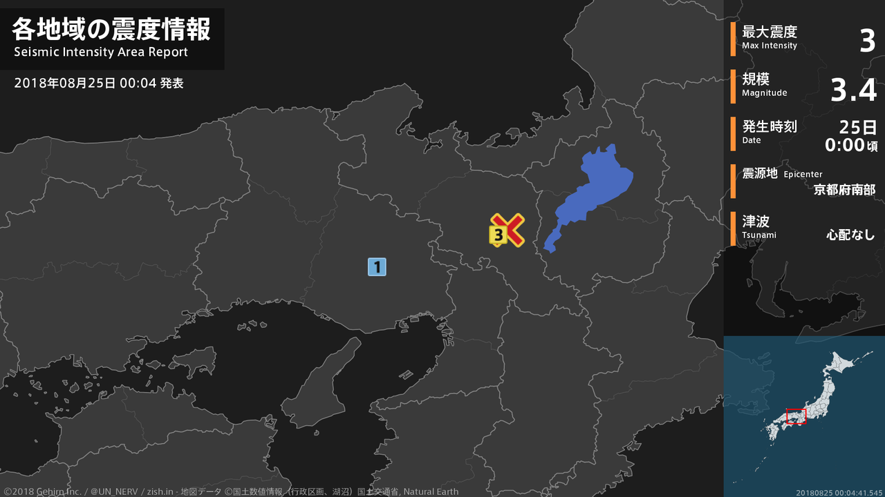 【地震情報 2018年8月25日】0時0分頃、京都府南部を震源とする地震がありました。震源の深さは約10km、地震の規模はM3.4、最大震度3を京都府で観測しています。この地震による津波の心配はありません。#地震 #京都府 #兵庫県