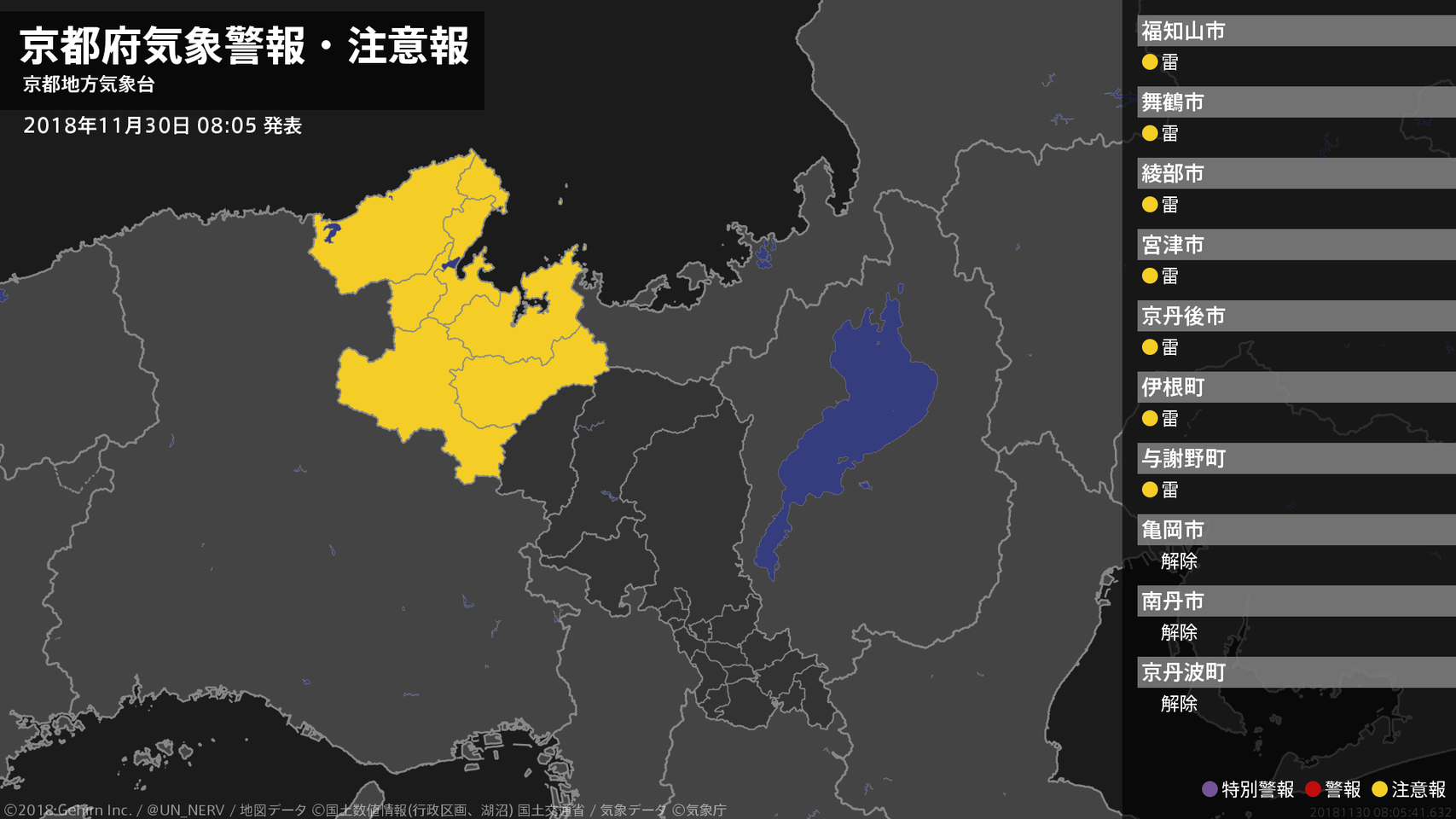 【京都府 気象警報・注意報 2018年11月30日 08:05】北部では、30日昼前まで急な強い雨や落雷に注意してください。#気象警報注意報 #京都府
