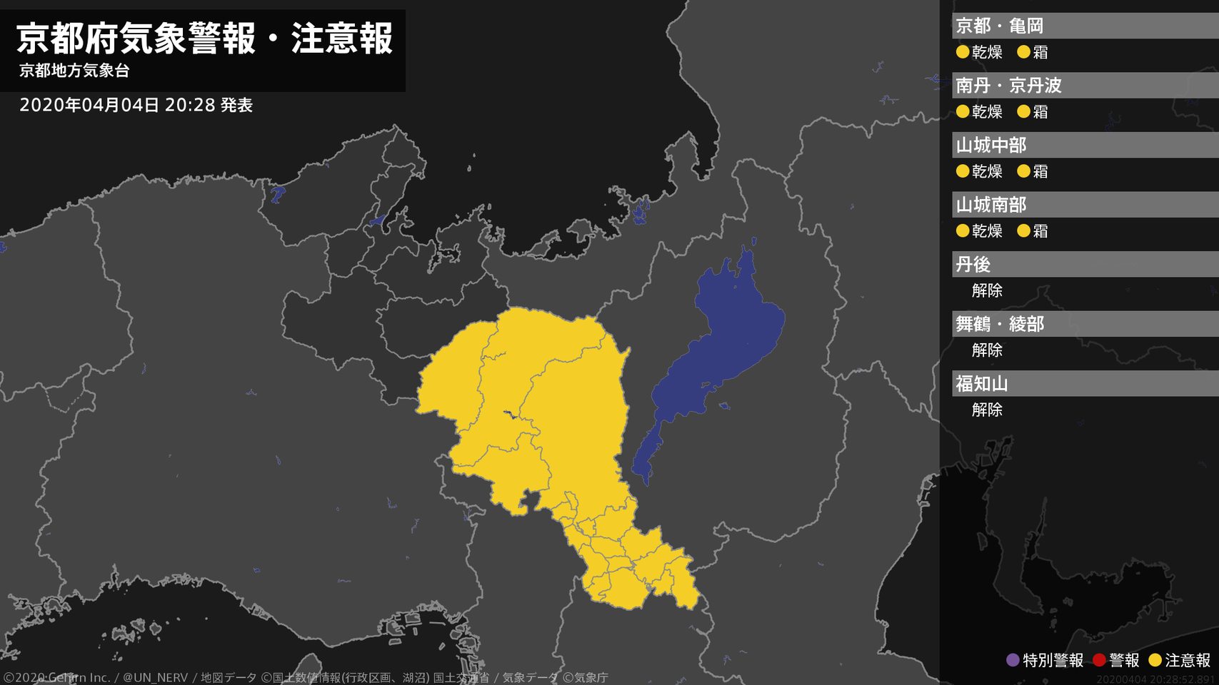 【京都府 気象警報・注意報 2020年04月04日 20:28】南部では、6日まで空気の乾燥した状態が続くため、火の取り扱いに、5日朝は霜に対する農作物の管理に注意してください。#気象警報注意報 #京都府