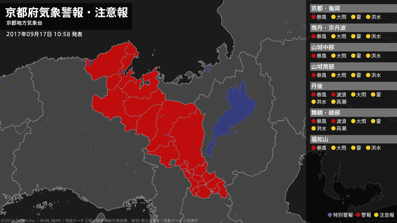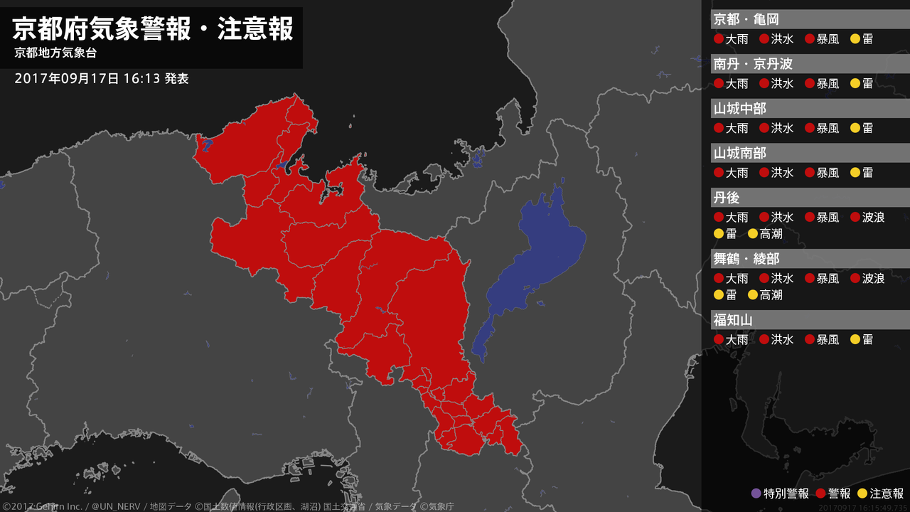 【京都府 気象警報 2017年09月17日 16:15】京都府では、17日夜のはじめ頃から18日明け方まで土砂災害や河川の増水に、17日夜のはじめ頃から18日未明まで低い土地の浸水に、18日未明まで暴風や高波に警戒してください。#気象警報 #気象警報注意報 #京都府