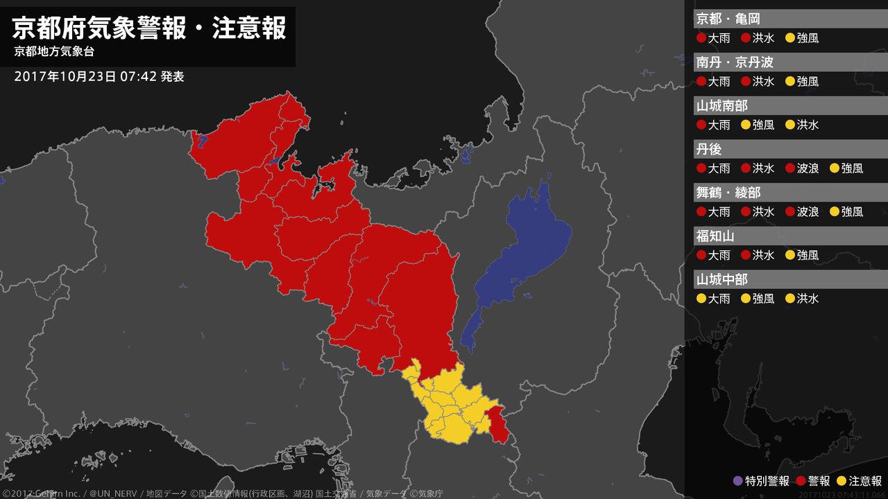 【京都府 気象警報・注意報 2017年10月23日 03:39】京都府では、23日夕方まで土砂災害や河川の増水に、23日朝まで暴風に、23日夜のはじめ頃まで高波に警戒してください。#気象警報注意報 #京都府