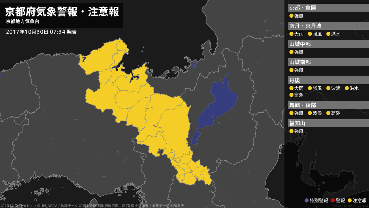【京都府 気象警報・注意報 2017年10月30日 10:23】京都府では、30日夕方まで強風に、31日昼前まで高波に注意してください。#気象警報注意報 #京都府