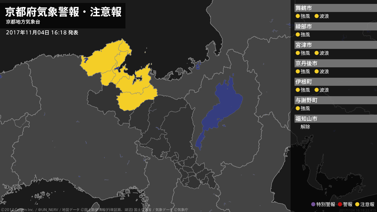【京都府 気象警報・注意報 2017年11月04日 16:18】北部では、4日夜のはじめ頃まで強風に、5日明け方まで高波に注意してください。#気象警報注意報 #京都府